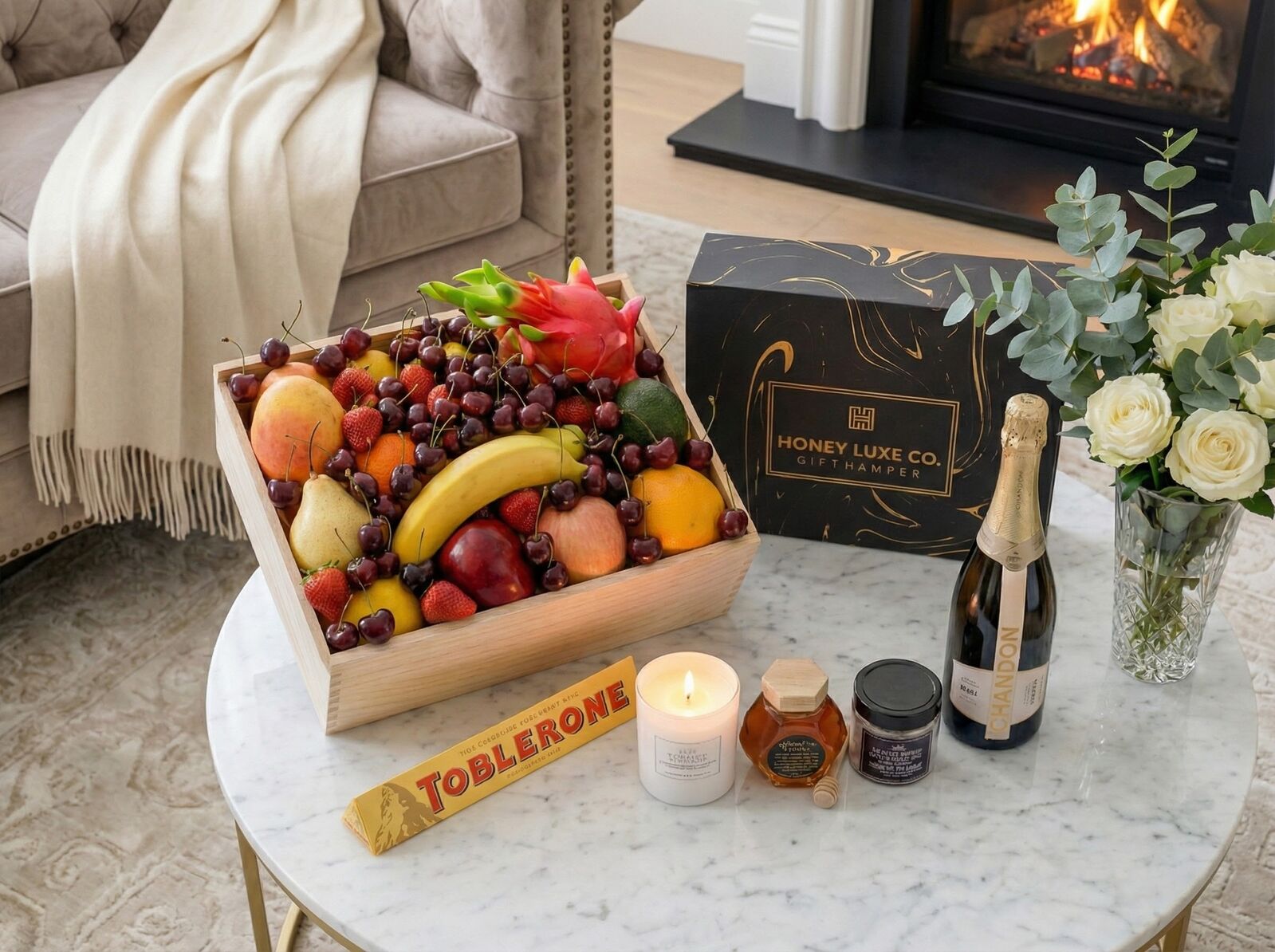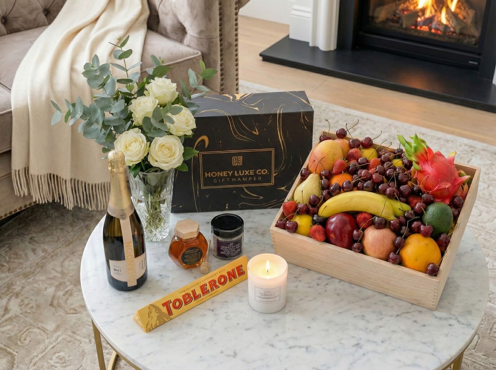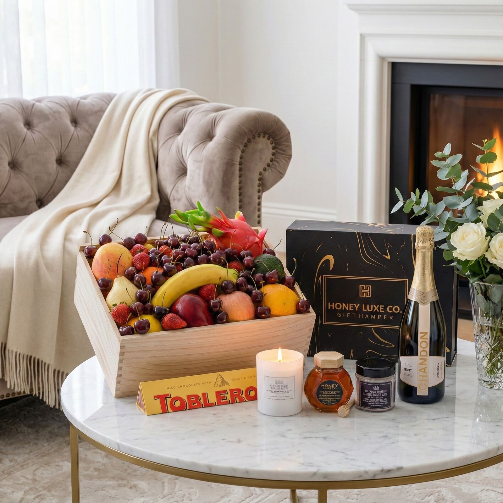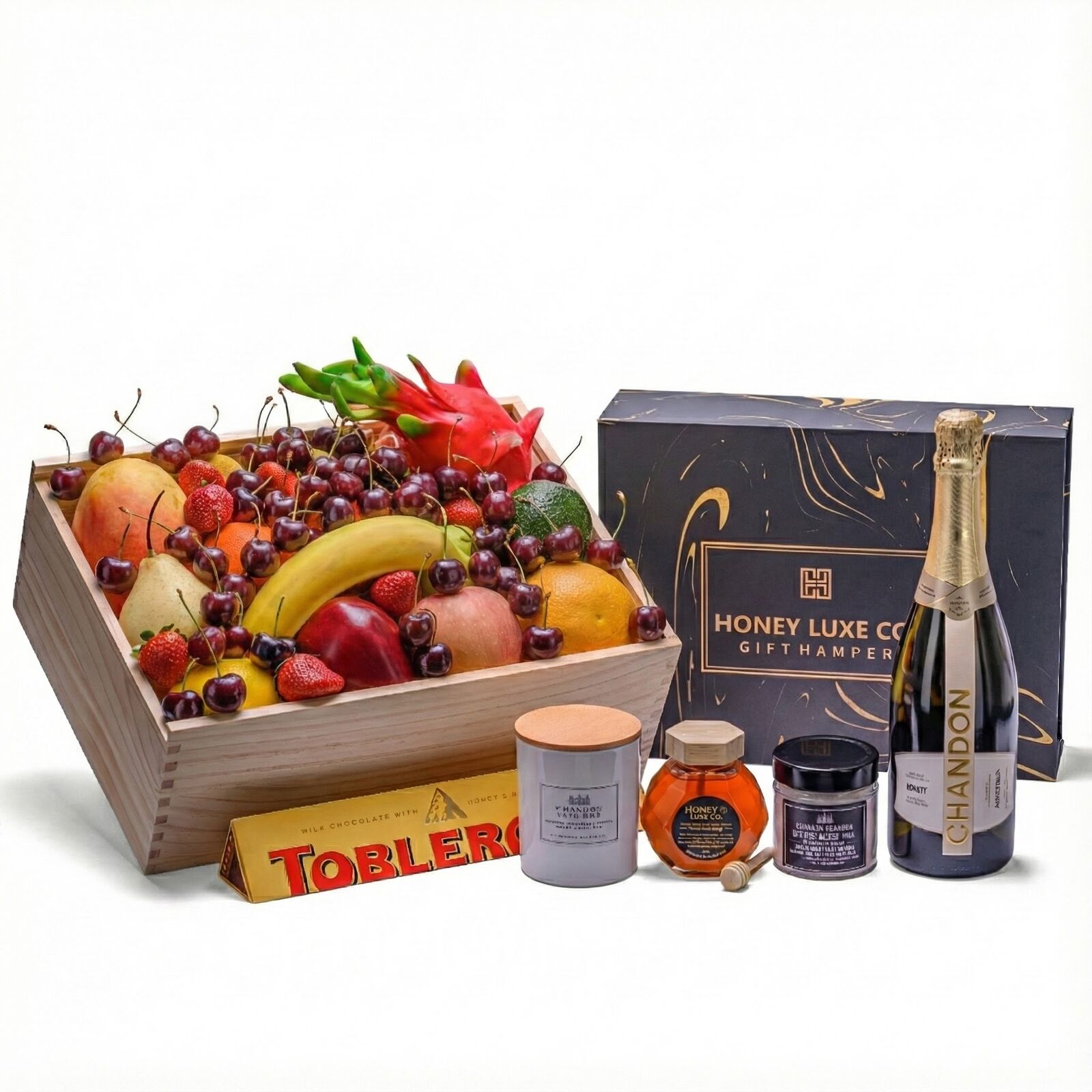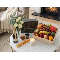 This sparkling Indulgence Fruit & Wellness Hamper combines orchard-fresh fruit, gourmet treats, and luxurious pamper essentials in one elegant gift. Chandon NV Sparkling Brut brings crisp sophistication, perfectly complementing the Toblerone Orange Twist Chocolate and 100% Australian RAW A-Grade Honey. To elevate the experience, a Château Lumière Scented Soy Candle and Relaxation Bath Salts create a serene, spa-like atmosphere — making this the ideal hamper for celebration, gratitude, and relaxation.