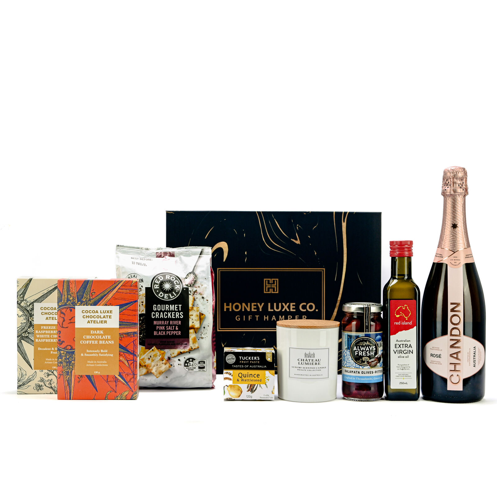 The centrepiece of this hamper is the gorgeous Chandon Rosé Sparkling Wine, known for its vibrant berry notes, beautiful pink hue, and fine bubbles. Light, lively, and celebratory — it’s the perfect match for the sweet + savoury balance of this hamper.
