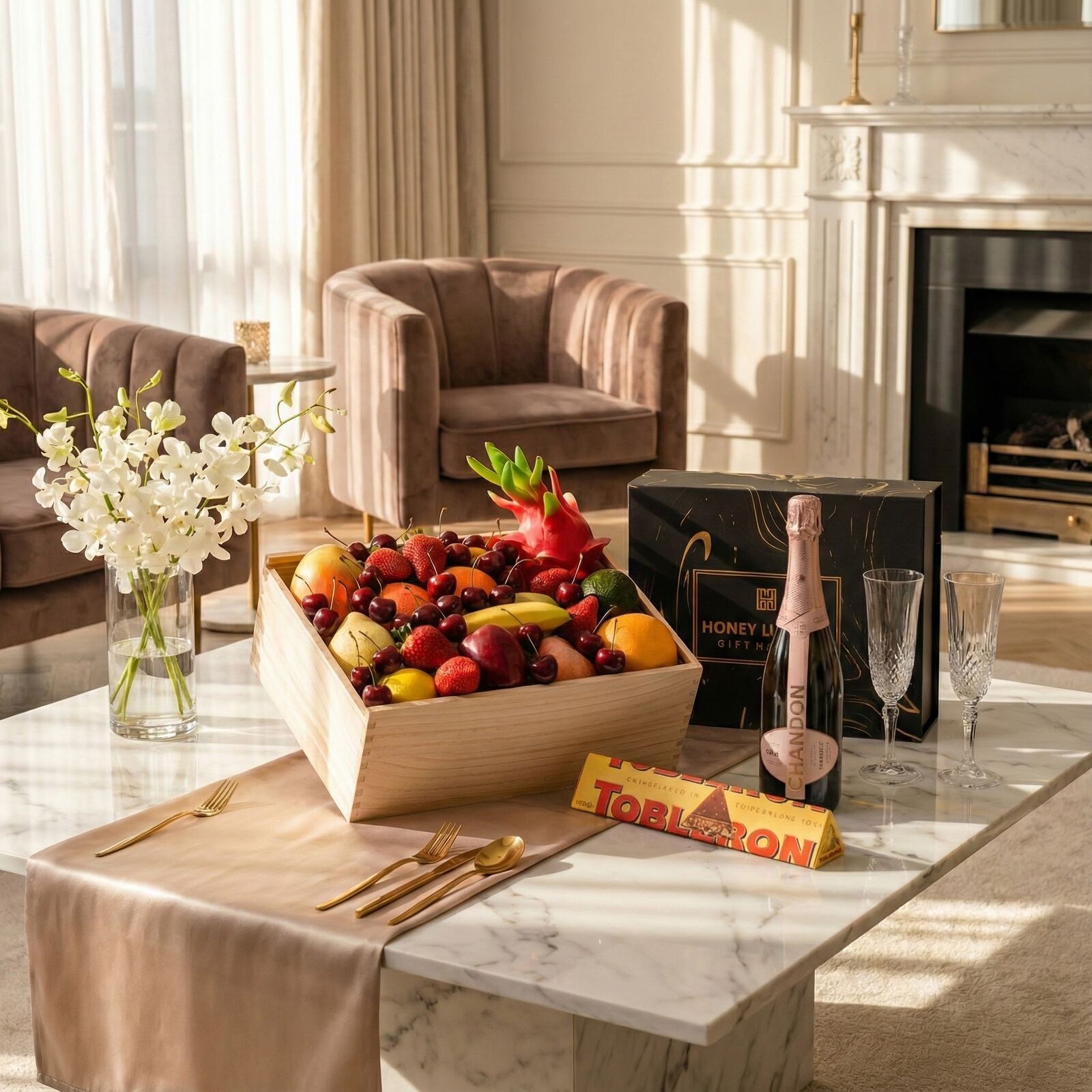 This sparkling Orchard Delight Hamper combines orchard-fresh premium fruit with the crisp elegance of Chandon NV Sparkling Brut for a light, refreshing gifting experience. With fruit selected for peak ripeness and flavour, paired with Chandon’s fine bubbles and bright citrus notes, this hamper delivers effortless celebration. A Toblerone Orange Twist 360 g adds a creamy Swiss chocolate finish with honey-almond nougat and a subtle citrus twist.