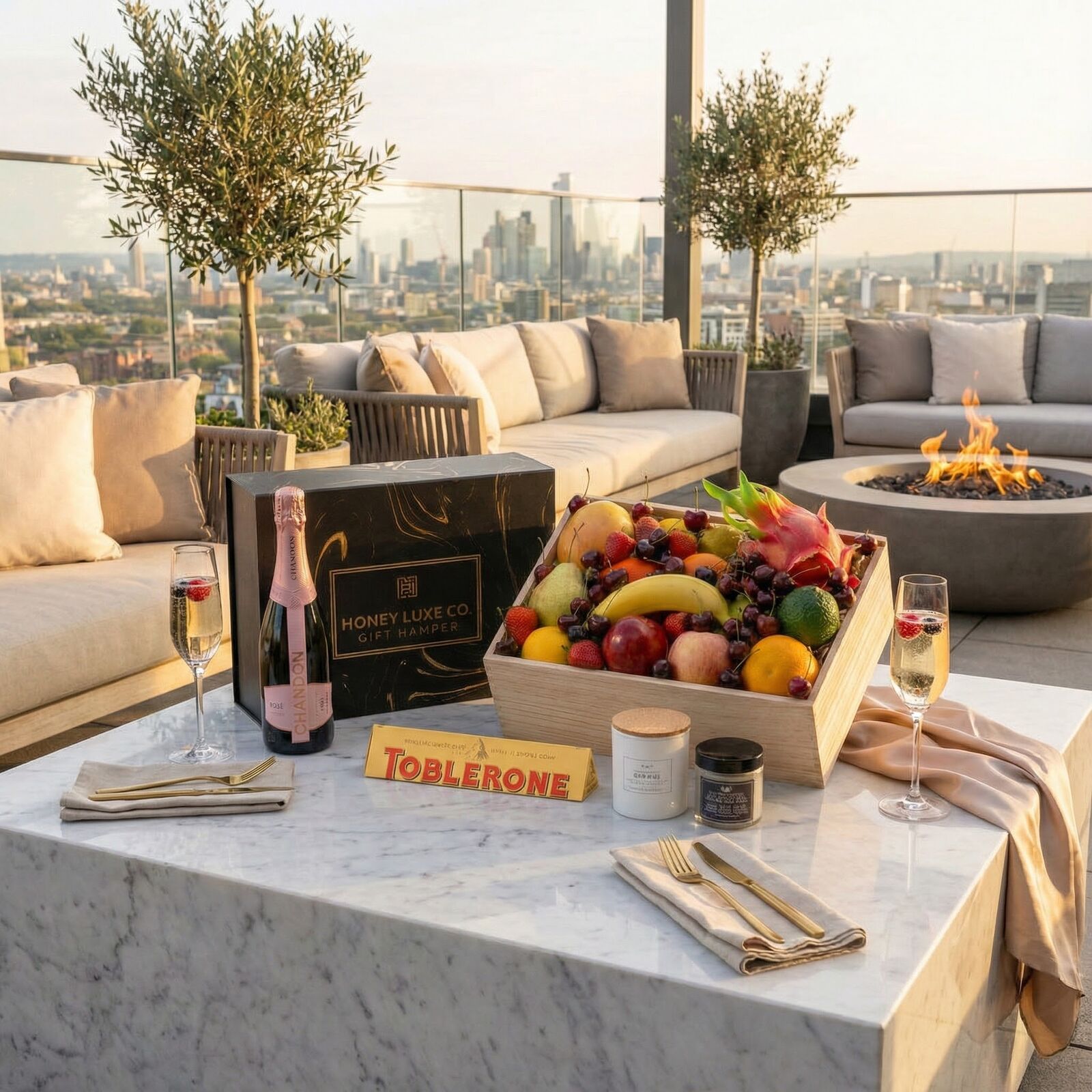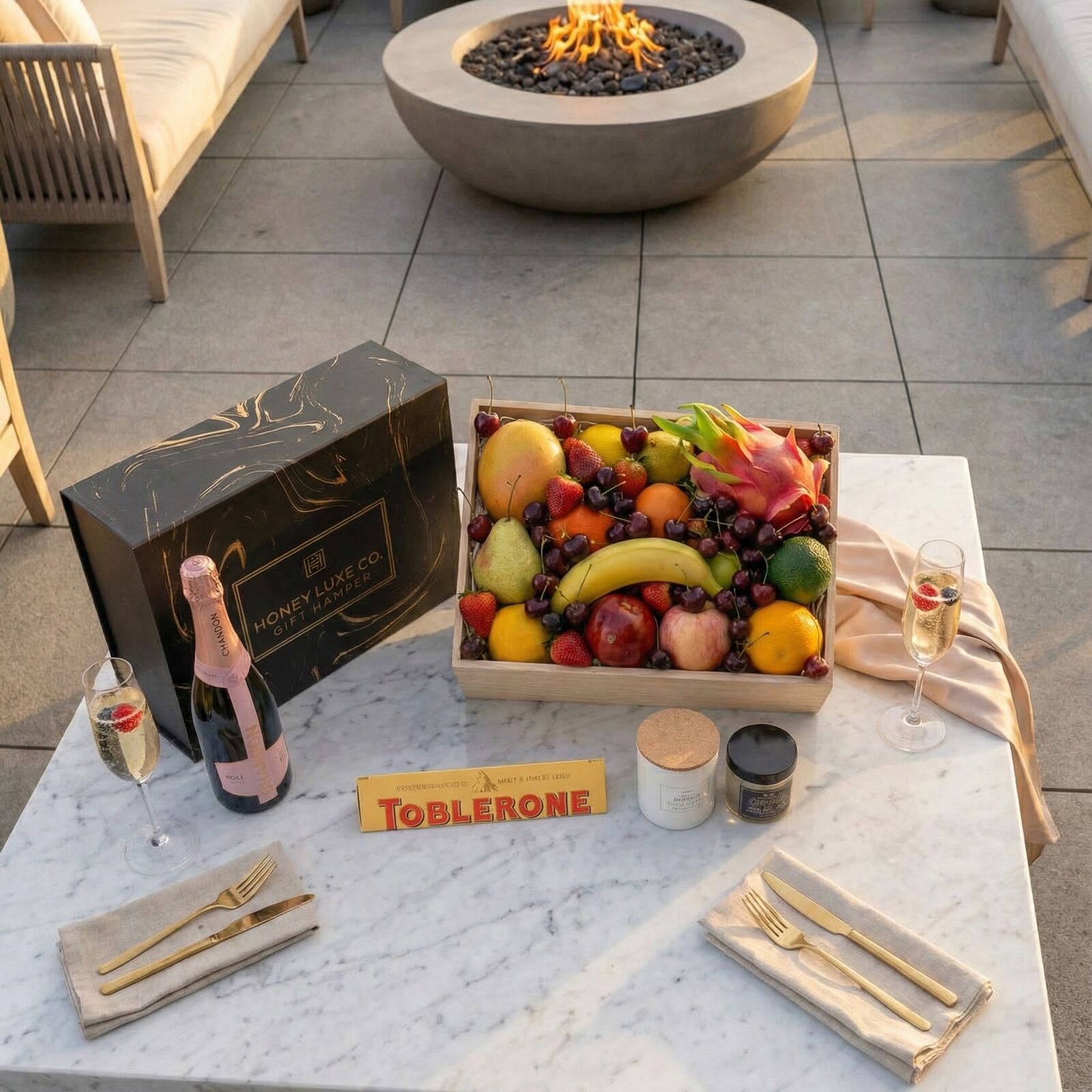 Blends rosé elegance with fresh orchard flavours, decadent chocolate and soothing wellness indulgence. Featuring Premium Handpicked Seasonal Fruit paired with Chandon NV Rosé, this celebratory curation is complemented by the citrus-infused Toblerone Orange Twist for a bold gourmet touch. A Château Lumière Luxury Candle (Large) and Relaxation Soak Bath Salts add calm, fragrance and spa-like serenity, all beautifully presented in a Premium Wooden Gift Box with a complimentary gift card.