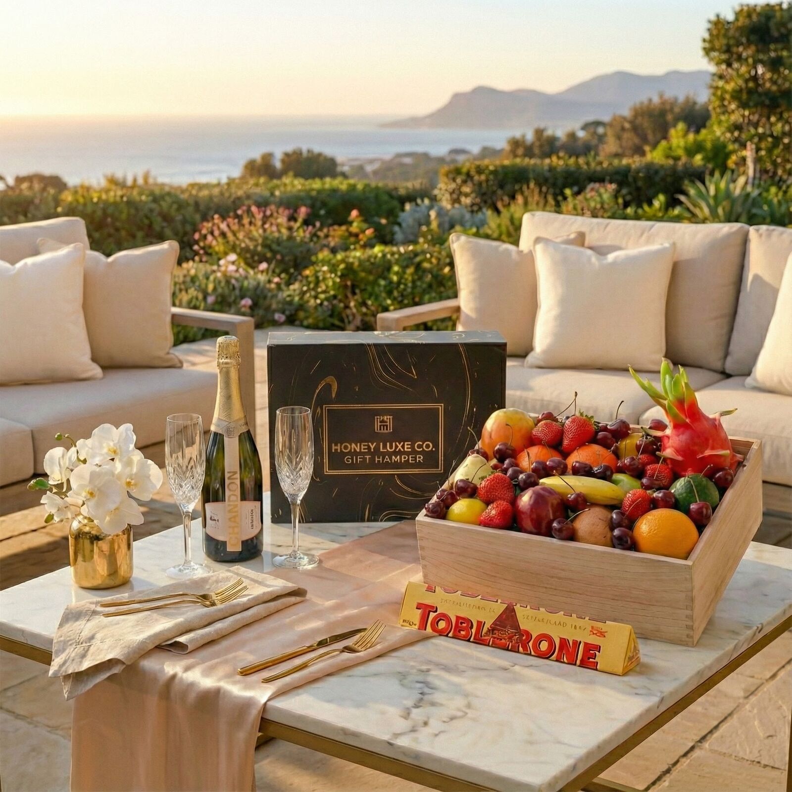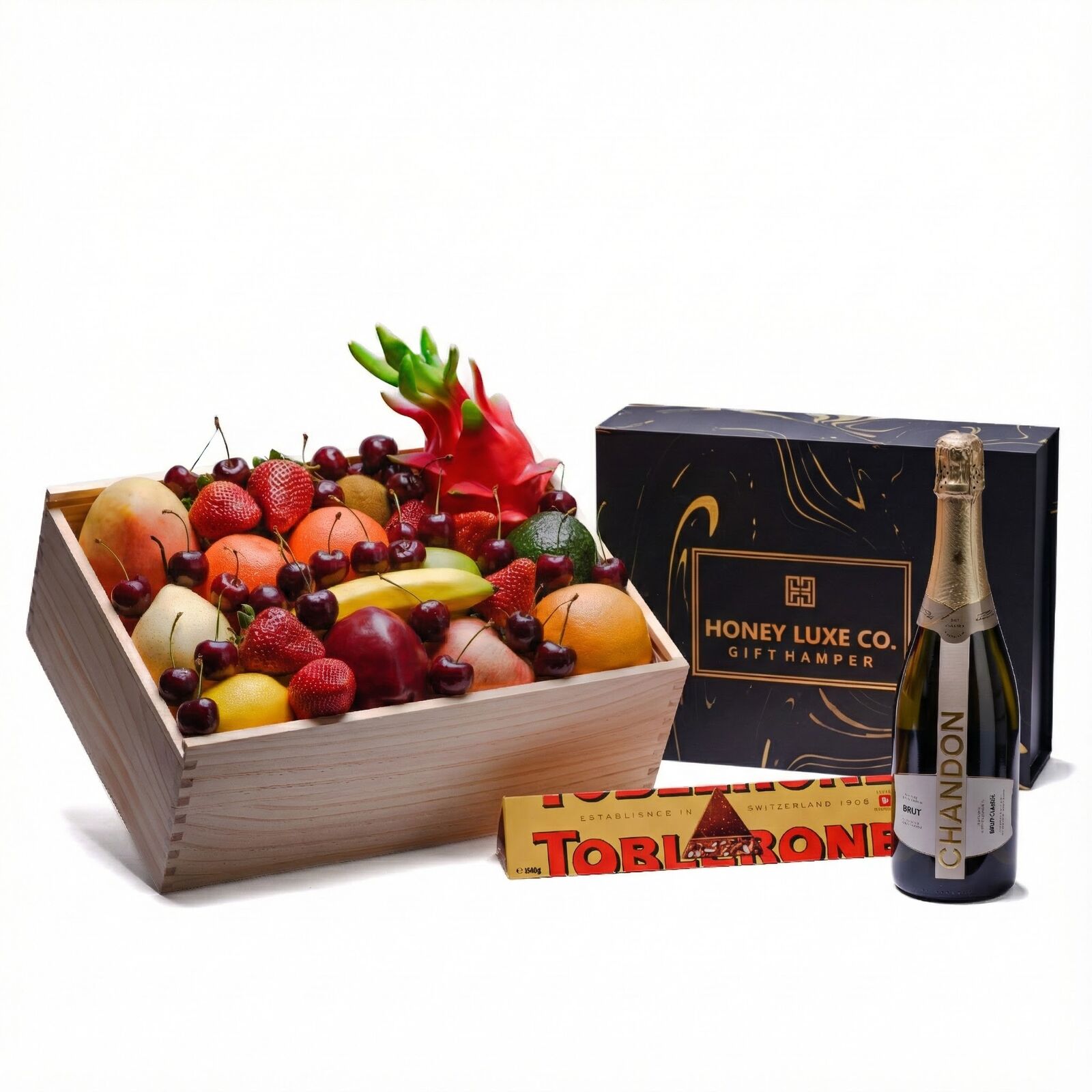 This sparkling Orchard Delight Hamper combines orchard-fresh premium fruit with the crisp elegance of Chandon NV Sparkling Brut for a light, refreshing gifting experience. With fruit selected for peak ripeness and flavour, paired with Chandon’s fine bubbles and bright citrus notes, this hamper delivers effortless celebration. A Toblerone Orange Twist 360 g adds a creamy Swiss chocolate finish with honey-almond nougat and a subtle citrus twist.