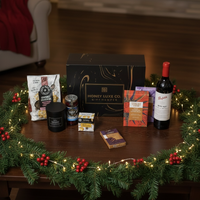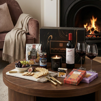 A refined celebration of craftsmanship and indulgence featuring Penfolds Bin 407 Cabernet Sauvignon with rich blackcurrant, cassis and dark chocolate notes, subtle oak and fine tannins. Paired with gourmet crackers, quince & wattleseed fruit paste, rich pitted Kalamata olives, Coffee & Dark Chocolate Bliss, golden caramel chocolate popcorn and a Château Lumière luxury scented candle in warm amber, vanilla and sandalwood, it offers a beautifully balanced blend of savoury depth, sweet elegance and serene sophistication.