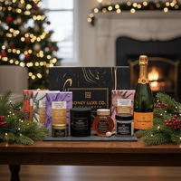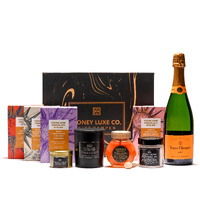 A luxurious blend of French elegance and modern indulgence featuring Veuve Clicquot Yellow Label Brut with lively brioche, pear, vanilla and almond notes. Paired with Château Lumière luxury candles in soothing gardenia, amber and musk, a botanical relaxation bath soak, artisan chocolates — raspberry white chocolate jellies, white chocolate strawberry bliss, coffee & dark chocolate bliss, golden caramel chocolate popcorn — and 100% Australian RAW A-Grade honey, it offers a beautifully balanced experience of celebration, calm and refined sweetness.