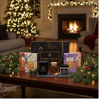 A serene blend of calm and indulgence featuring Château Lumière luxury candles in soothing gardenia, amber and musk, paired with relaxation bath salts for a tranquil escape. Complemented by gourmet treats including raspberry white chocolate jellies, white chocolate strawberry bliss, coffee & dark chocolate bliss, golden caramel chocolate popcorn and 100% Australian RAW A-Grade honey, it offers a beautifully balanced moment of comfort, warmth and elegant self-care.
