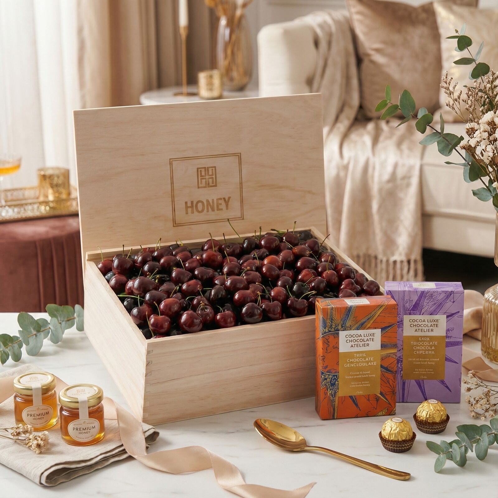 A refined expression of sweetness, elegance and indulgence. Pairing premium handpicked seasonal cherries with a curated selection of artisan chocolate treats, this hamper delivers a beautifully balanced gifting experience that feels both luxurious and comforting. From rich Coffee & Dark Chocolate Bliss to indulgent Golden Caramel Chocolate Popcorn, each element is chosen to complement the natural juiciness and sweetness of premium cherries.