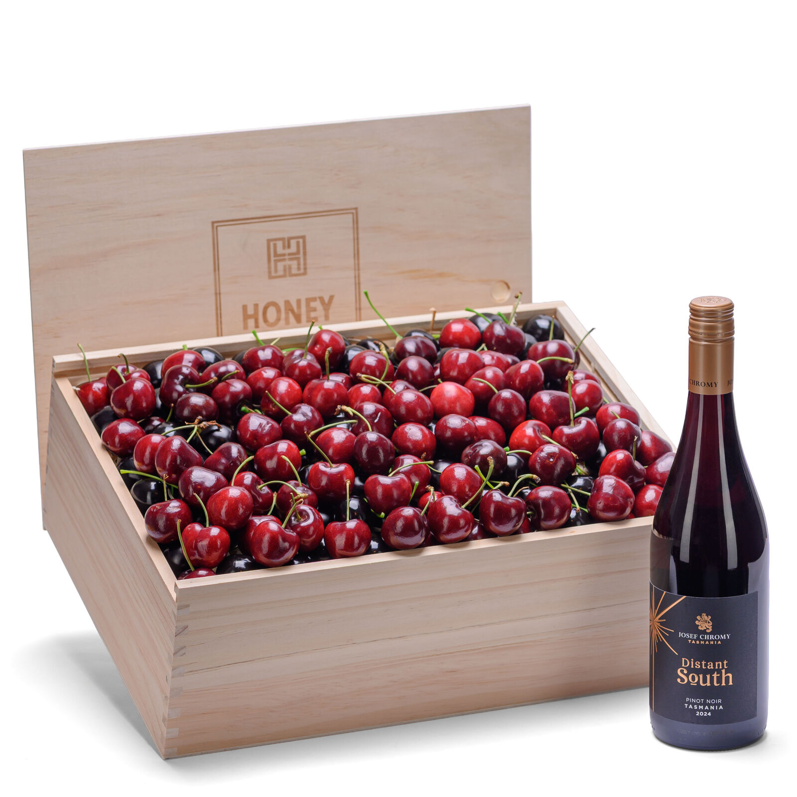 An elegant expression of balance and refinement, bringing together the natural sweetness of premium handpicked cherries with the cool-climate sophistication of Josef Chromy Distant South Tasmania Pinot Noir. This Tasmanian Pinot Noir is known for its delicate red-berry character, subtle spice and silky texture — a graceful pairing with the vibrant freshness of premium seasonal cherries.