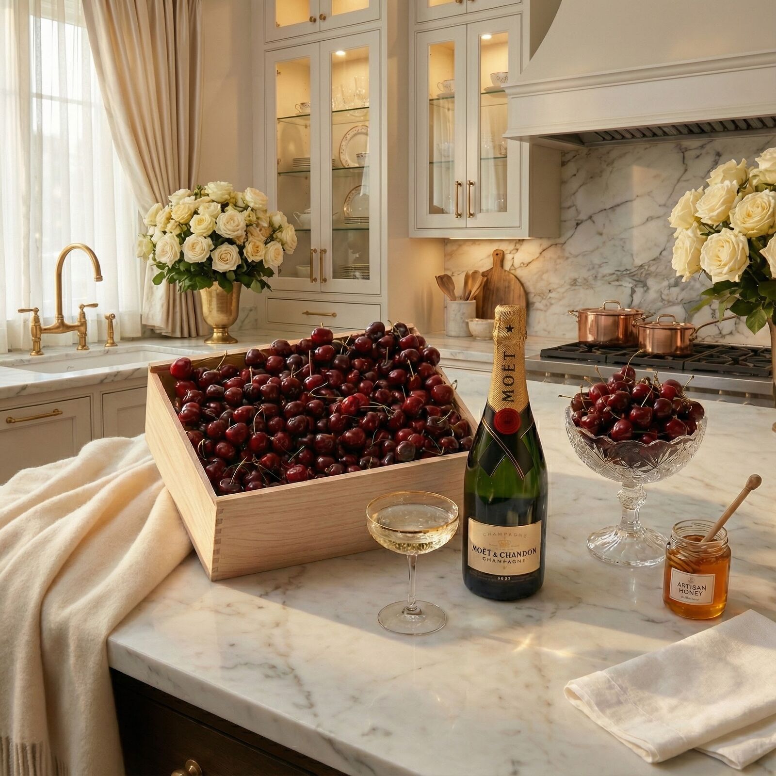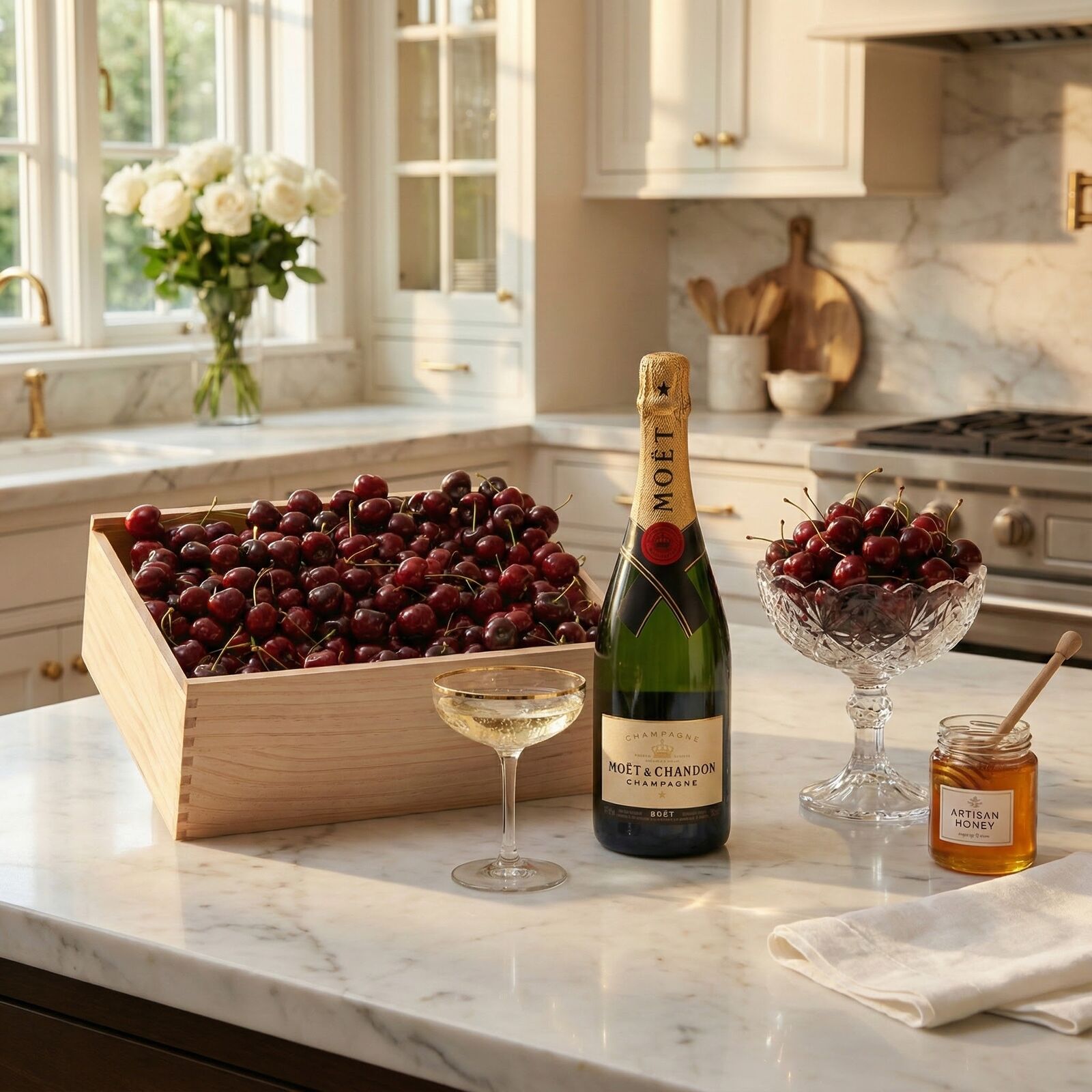 A refined and elegant seasonal gift, blending fresh premium cherries with world-class champagne. This hamper features Premium Handpicked Seasonal Cherries, selected for size, sweetness and vibrant flavour. The natural freshness of the cherries pairs beautifully with the included Moët & Chandon Impérial Brut, celebrated for its bright citrus, apple and brioche notes and fine, elegant bubbles.