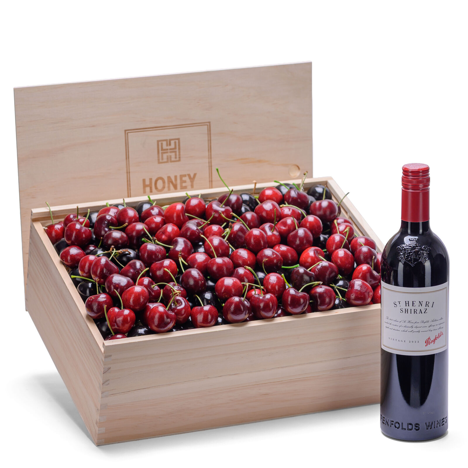 Crafted for those who appreciate iconic Australian winemaking paired with premium seasonal fruit. Featuring the legendary Penfolds St Henri Shiraz, this hamper delivers depth, elegance and timeless prestige alongside the natural sweetness of premium handpicked cherries.Renowned for its balance, structure and longevity, St Henri Shiraz showcases rich dark fruit, spice and refined tannins — a sophisticated contrast to the vibrant freshness of seasonal cherries.