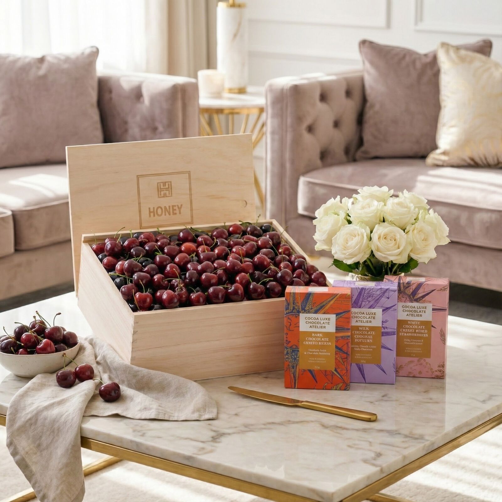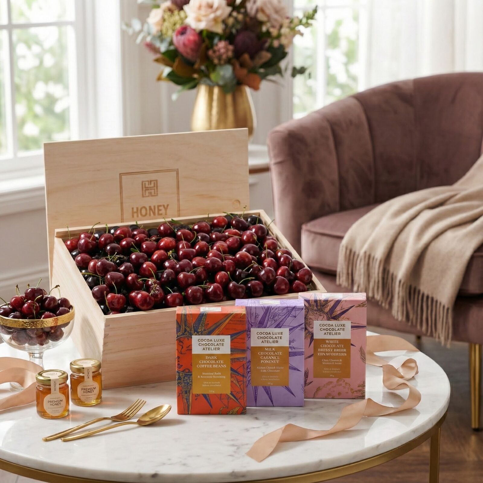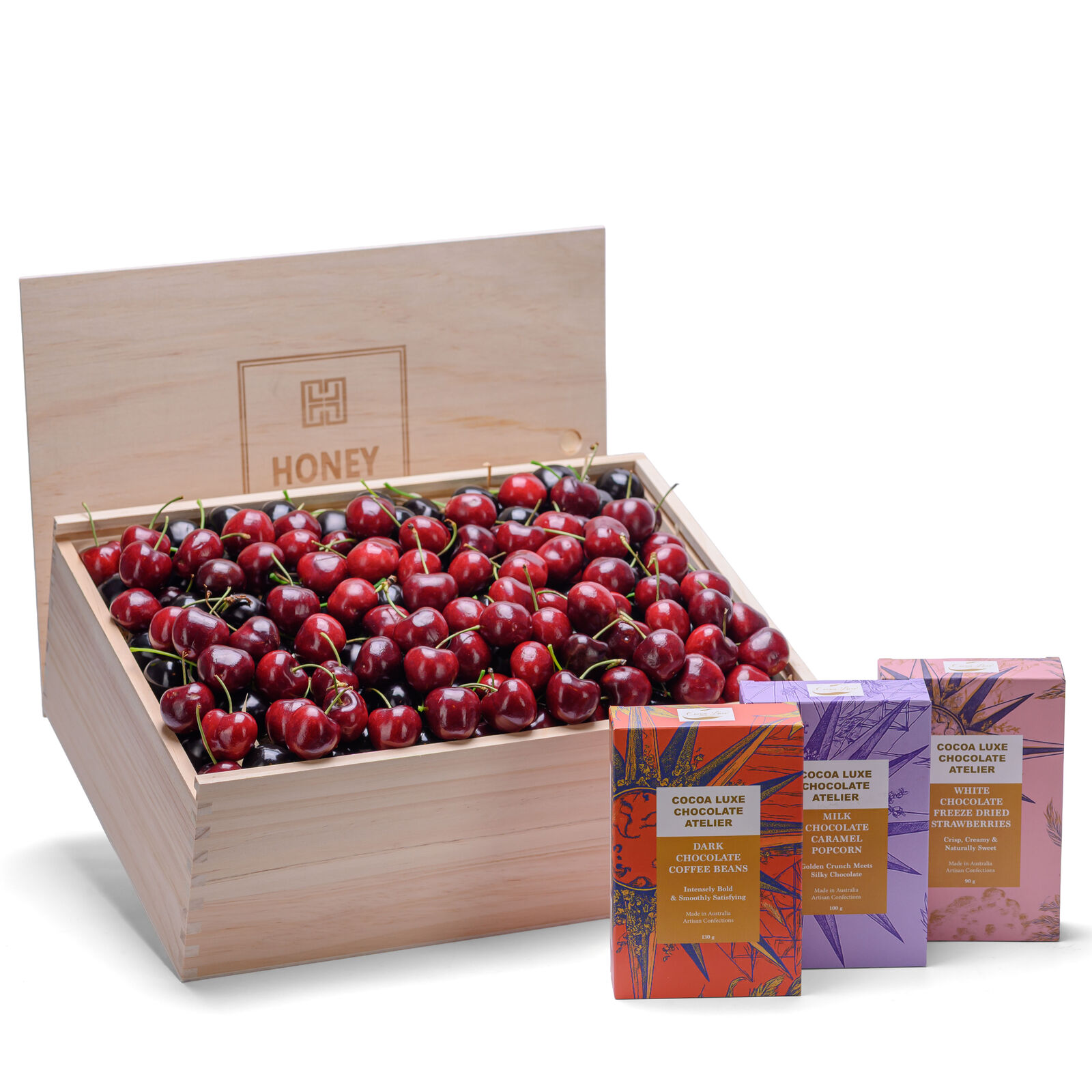 A luxurious seasonal fruit hamper combining premium handpicked cherries with an indulgent trio of artisan chocolates. Beautifully presented in a premium wooden gift box, this hamper is perfect for gifting, celebrations, and corporate occasions.