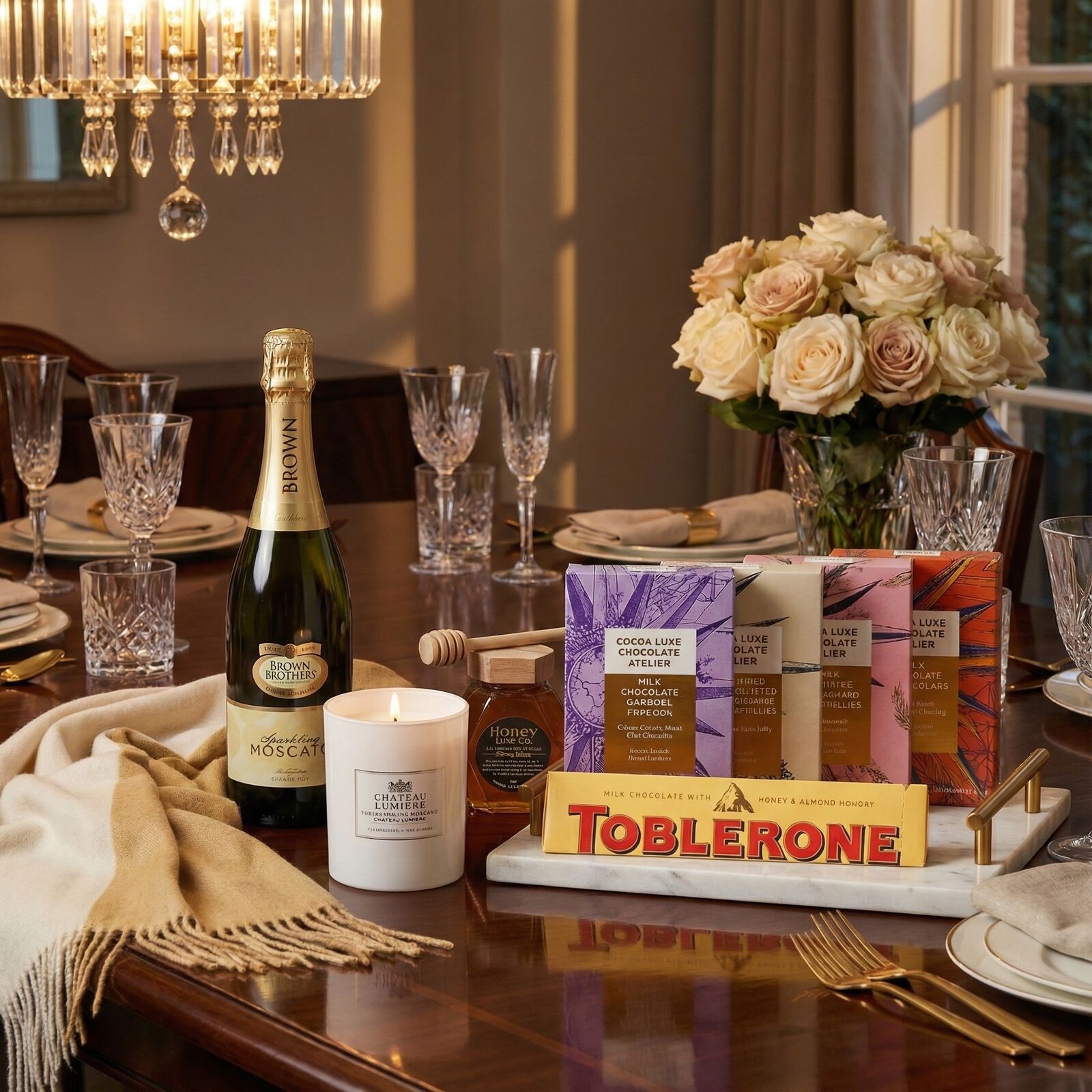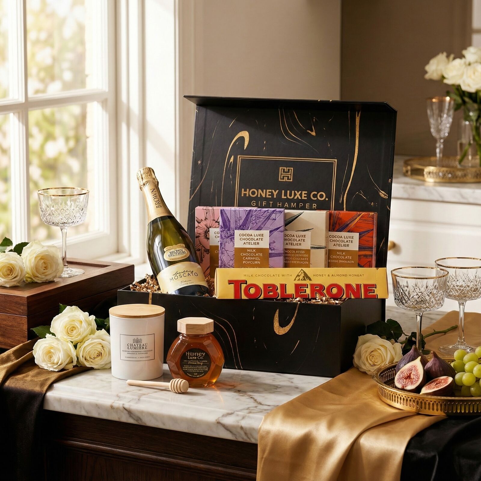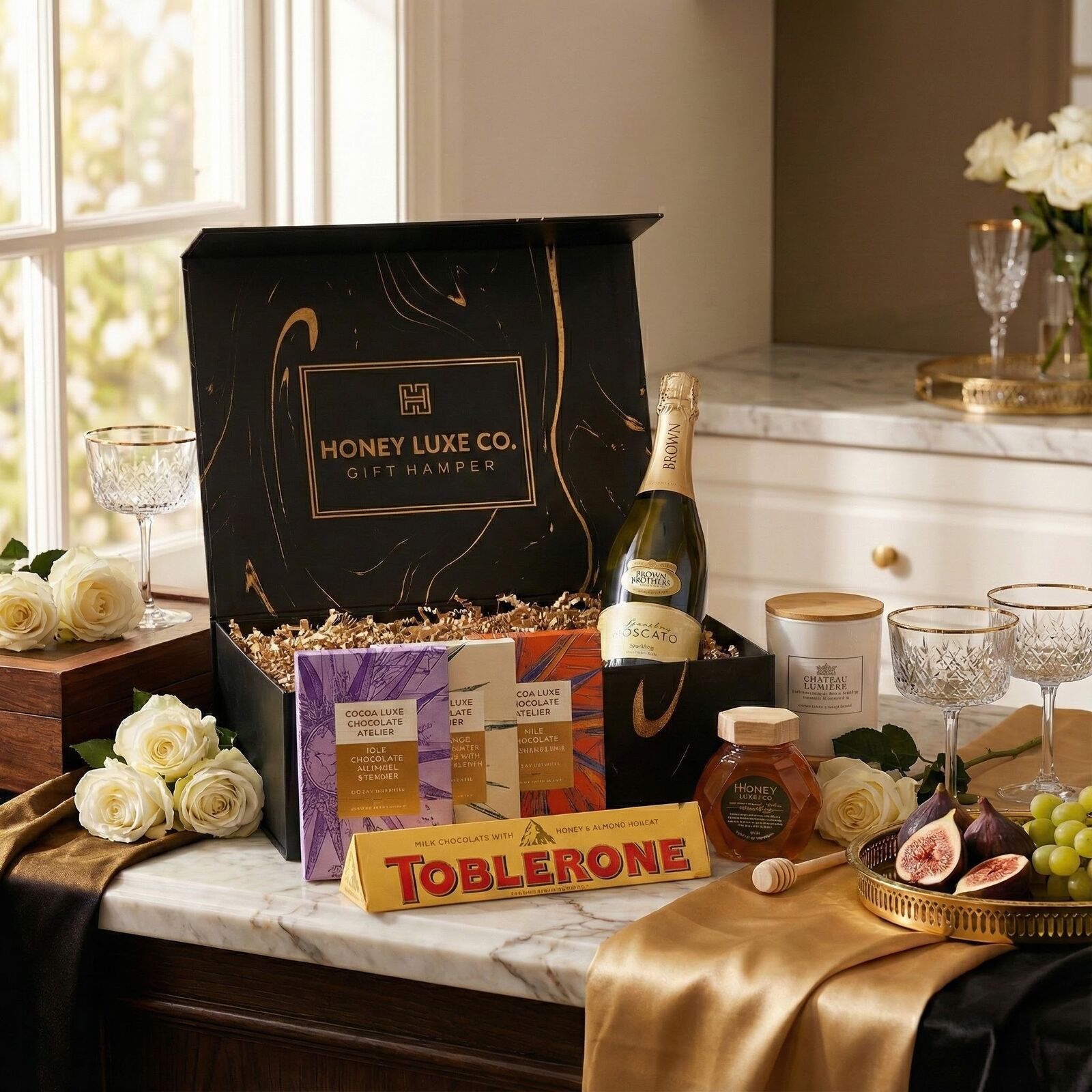 A luxurious indulgence hamper featuring Brown Brothers Sparkling Moscato, paired with premium chocolates including Toblerone Orange Twist, Raspberry White Chocolate Jellies, White Chocolate Strawberry Bliss, Coffee & Dark Chocolate Bliss, and Golden Caramel Chocolate Popcorn. Finished with 100% Australian RAW A-Grade Premium Honey and a Château Lumière luxury scented candle, this elegant gift is perfect for effortless, feel-good gifting.