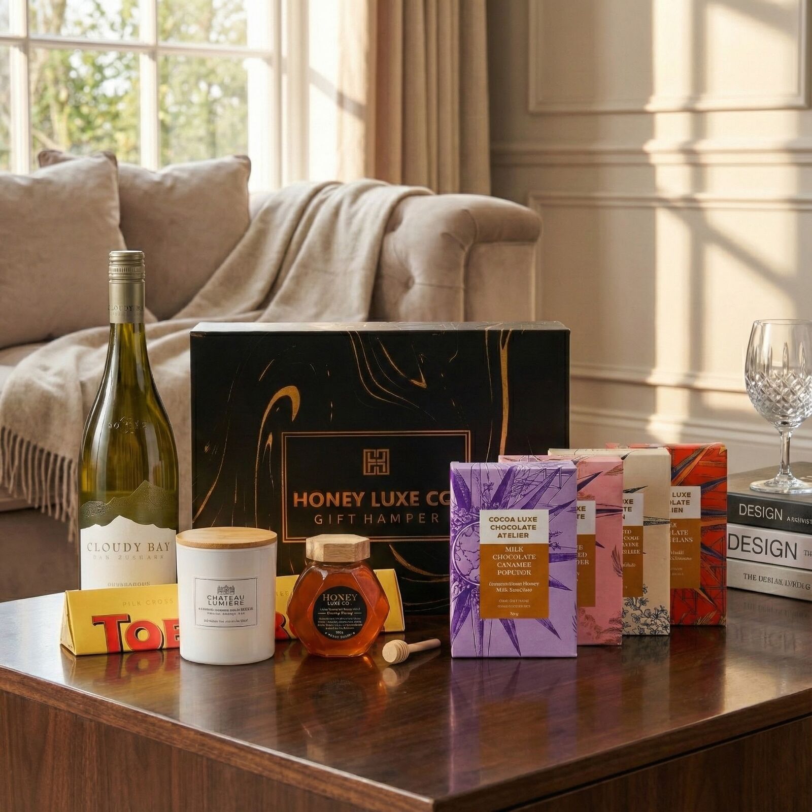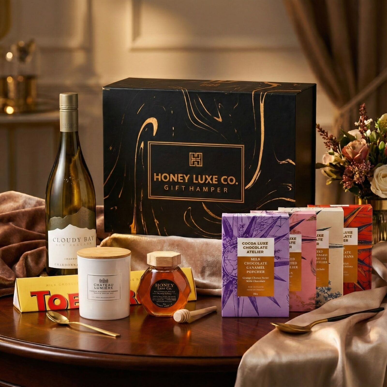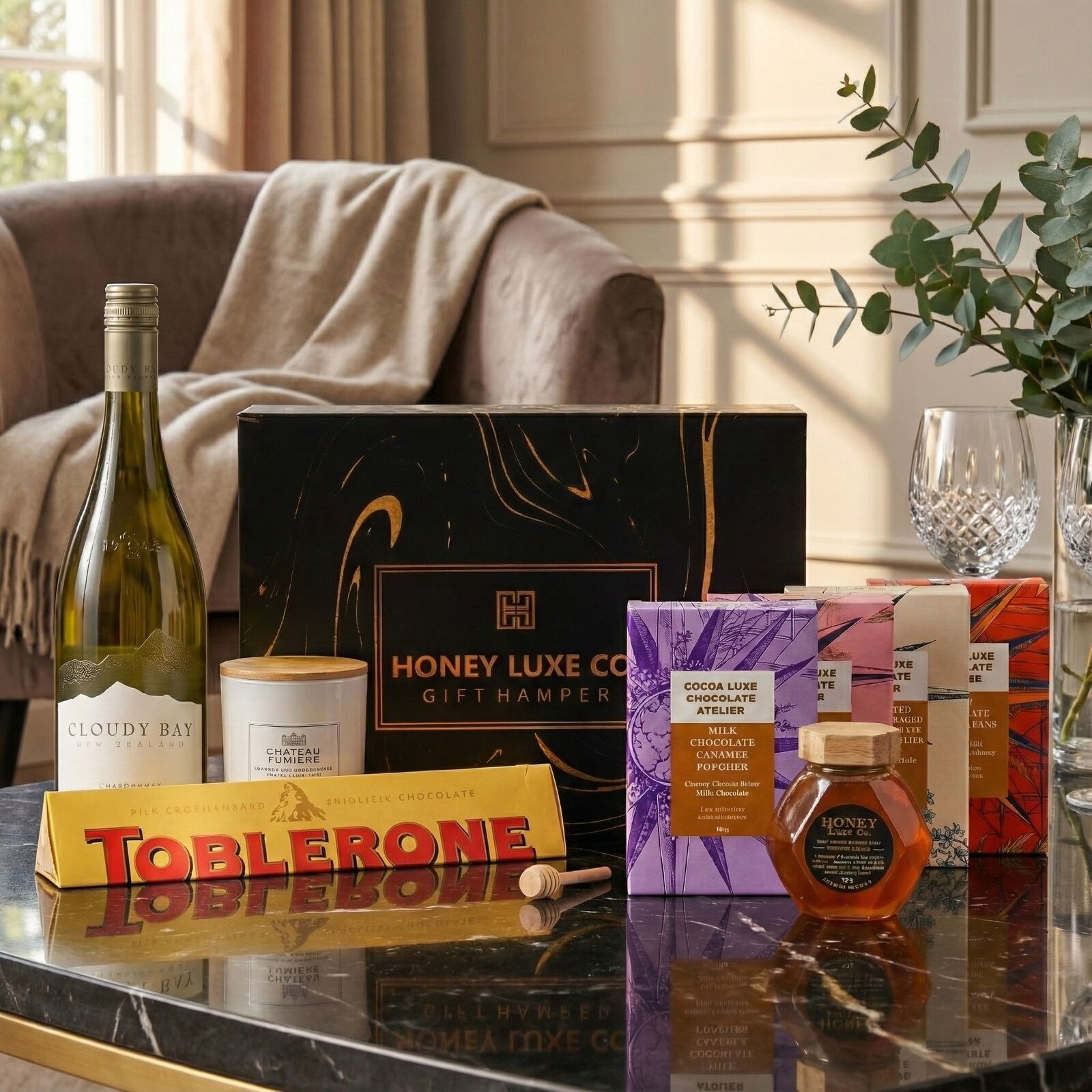 A refined luxury gift perfect for celebrations and premium corporate occasions. Featuring Cloudy Bay Sauvignon Blanc, this elegant white wine is paired with an indulgent selection of gourmet chocolates including Toblerone Orange Twist, Raspberry White Chocolate Jellies, White Chocolate Strawberry Bliss, Coffee & Dark Chocolate Bliss, and Golden Caramel Chocolate Popcorn. Finished with 100% Australian RAW A-Grade Premium Honey and a Château Lumière luxury scented candle, this hamper delivers effortless indulgence and feel-good gifting.