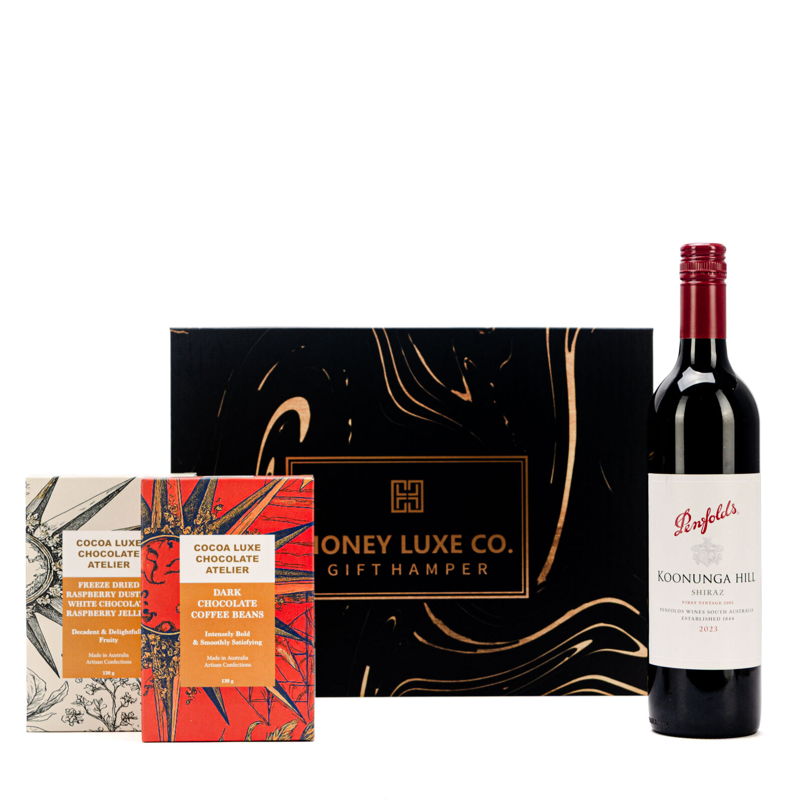 A bottle of Penfolds Koonunga Hill Shiraz Cabernet completes the experience, renowned for its dark berry flavours, gentle spice, and silky finish — the perfect companion to gourmet chocolates.