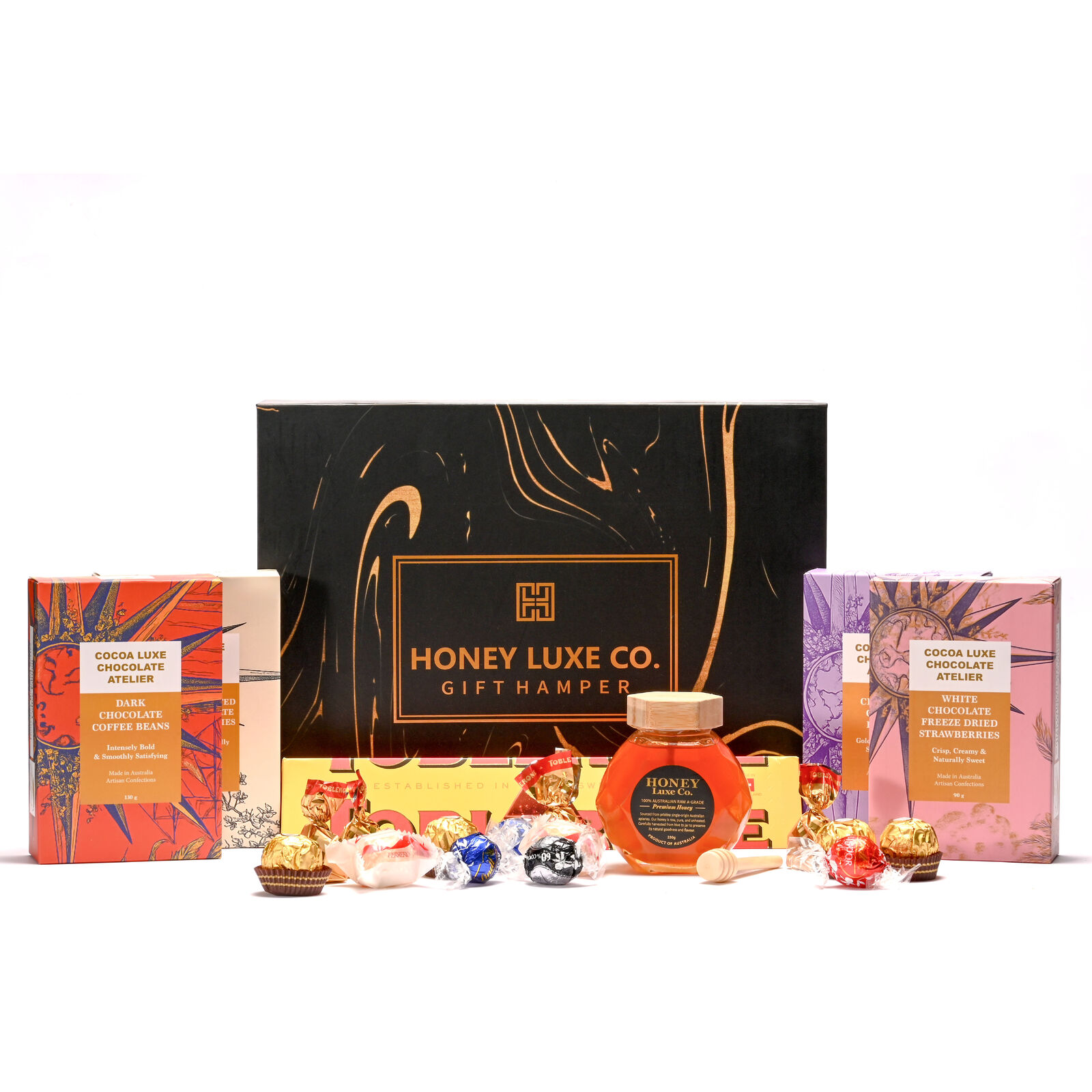 To complete the collection, 100% Australian RAW A-Grade Premium Honey adds a touch of natural golden sweetness — balancing the indulgent richness with purity and warmth.