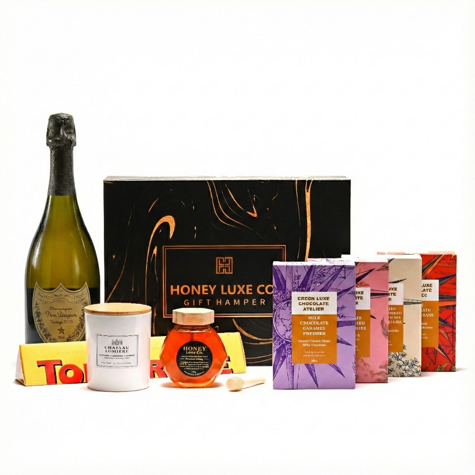 The ultimate luxury gift for milestone celebrations and elite corporate occasions. Featuring Dom Pérignon Vintage Champagne, this prestige hamper pairs one of the world’s most iconic Champagnes with an indulgent selection of gourmet chocolates including Toblerone Orange Twist, Raspberry White Chocolate Jellies, White Chocolate Strawberry Bliss, Coffee & Dark Chocolate Bliss, and Golden Caramel Chocolate Popcorn. Finished with 100% Australian RAW A-Grade Premium Honey and a Château Lumière luxury scented candle, this hamper delivers unforgettable indulgence with lasting impact.