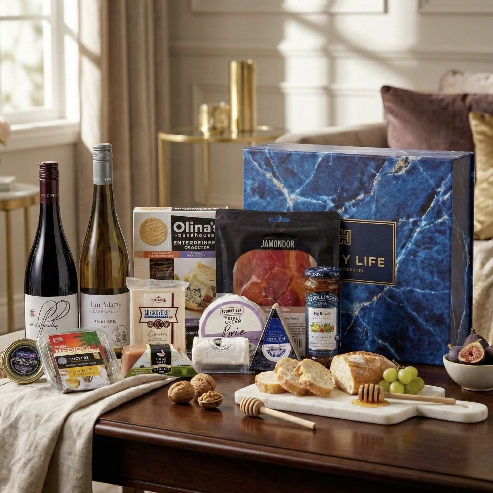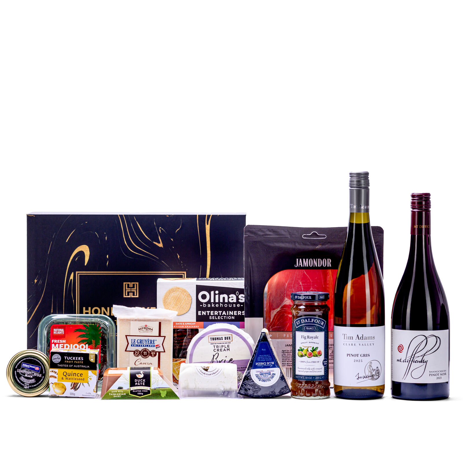 An elevated celebration of fine wine and exceptional food. Thoughtfully curated for sophisticated entertaining and premium gifting, this hamper pairs two distinguished wines with an indulgent selection of artisan cheeses, charcuterie, caviar and gourmet accompaniments. Featuring the elegant freshness of Tim Adams Clare Valley Pinot Gris alongside the refined depth of Mt Difficulty Central Otago Pinot Noir, this hamper offers a perfectly balanced wine experience. Complemented by cave-aged Gruyère, triple cream Brie, blue cheese and French chèvre, along with duck pâté, Serrano ham, premium caviar, fruit pastes and artisan crackers, it delivers a complete grazing and entertaining experience.