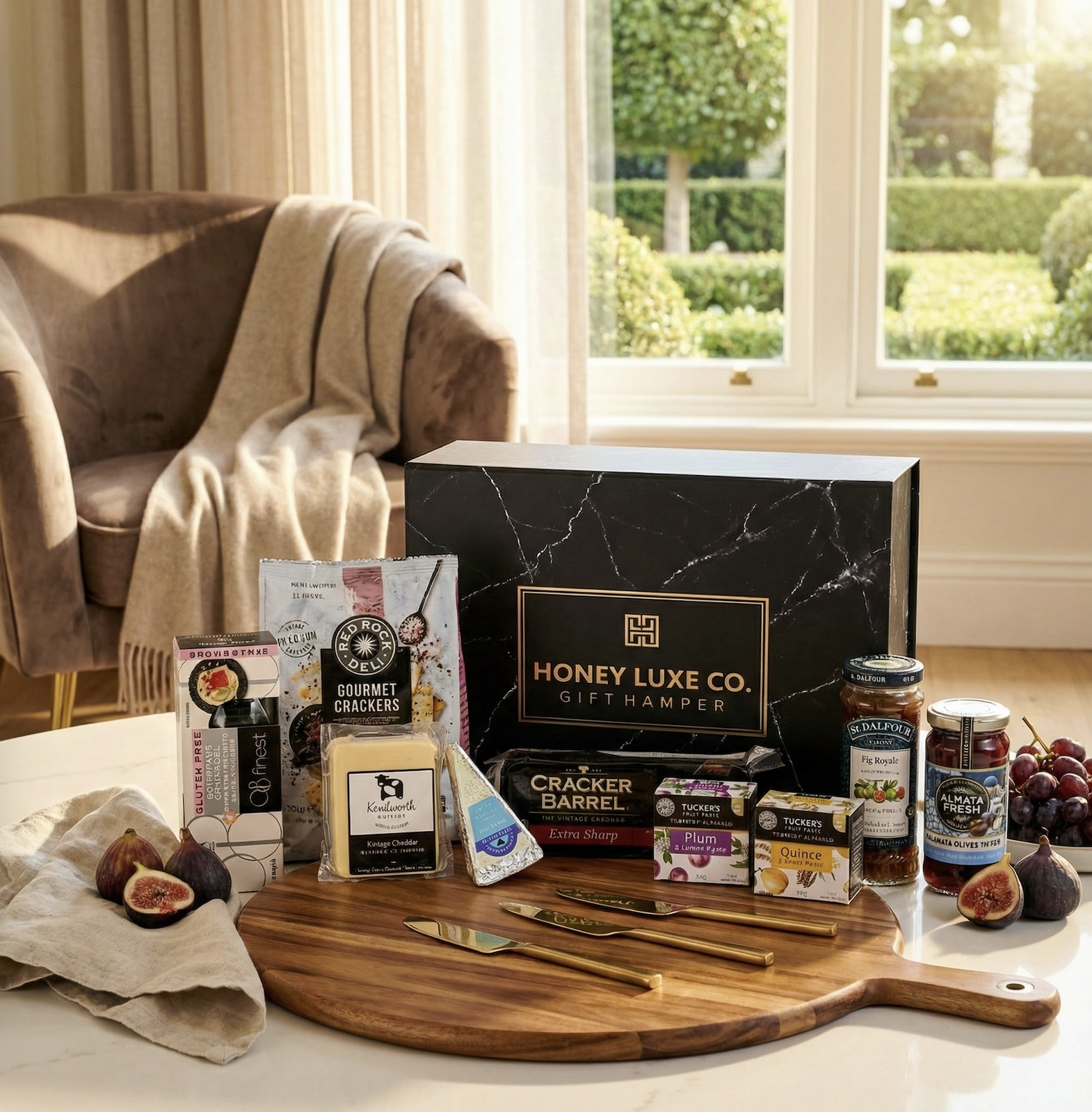 Elegantly presented in a Honey Luxe Co. Luxury Gift Box with a complimentary gift card, this hamper is ideal for gourmet gifting, professional appreciation, celebration events, and luxury entertaining moments.