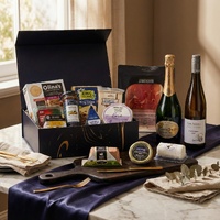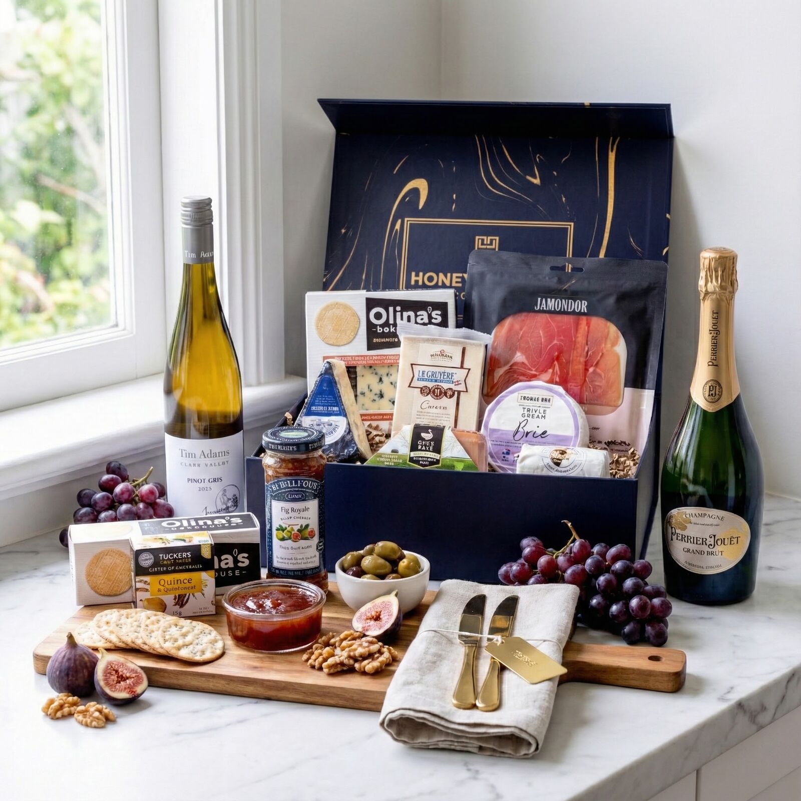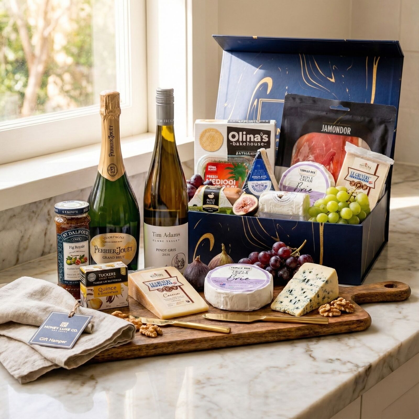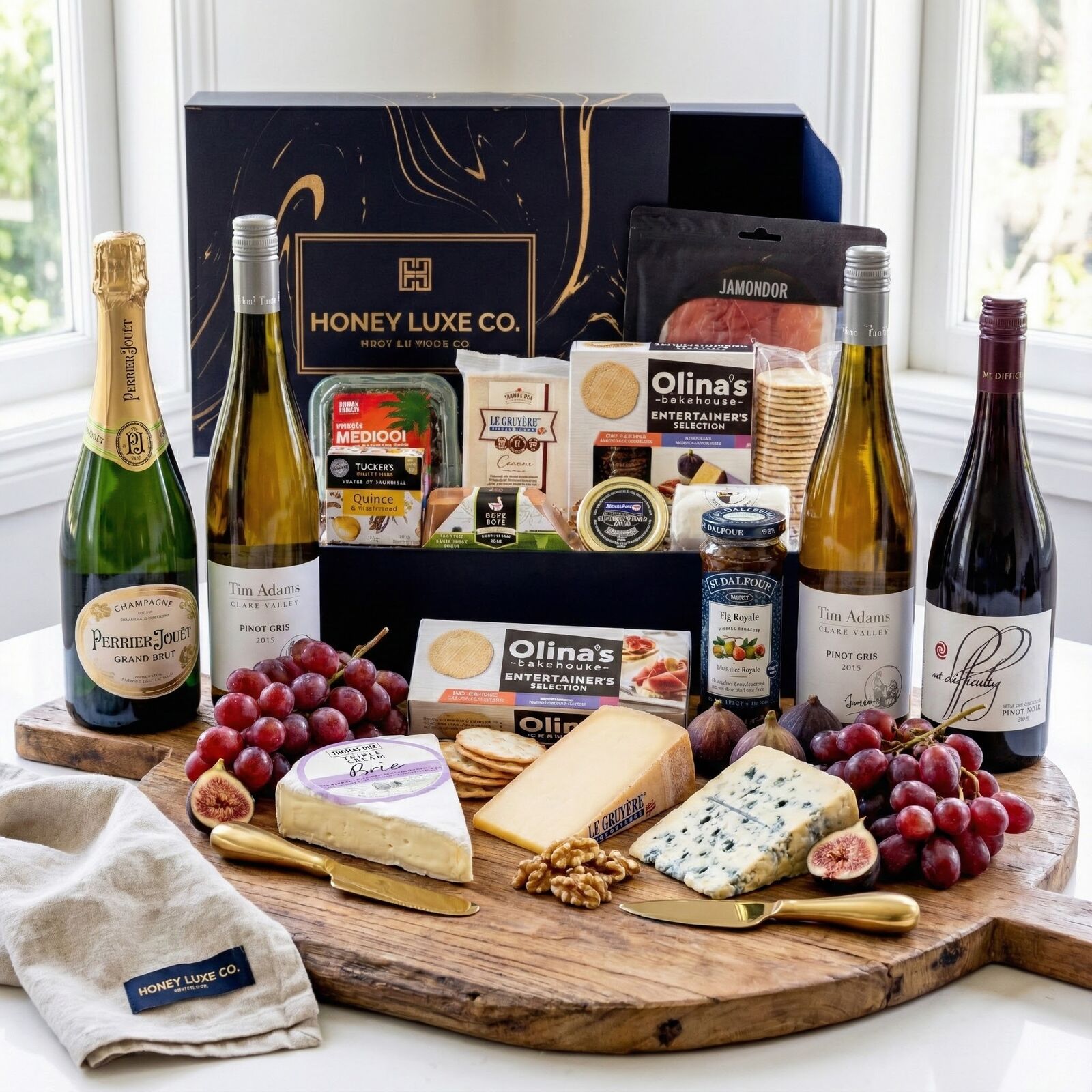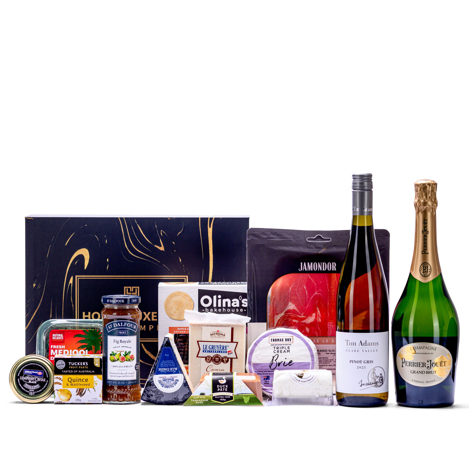 An elevated expression of fine taste and indulgence, curated for sophisticated entertaining and premium gifting. This impressive hamper pairs the elegance of Perrier-Jouët Grand Brut Champagne with the freshness of Tim Adams Clare Valley Pinot Gris, creating a versatile wine pairing experience for every occasion. Surrounding the wines is a meticulously selected assortment of artisan cheeses, charcuterie, caviar and gourmet accompaniments, designed to create a complete luxury grazing experience. From cave-aged Gruyère and triple cream Brie to Tasmanian duck pâté, Serrano ham, premium black caviar, fruit pastes and artisan crackers, every element has been chosen to complement both champagne celebrations and relaxed wine moments.