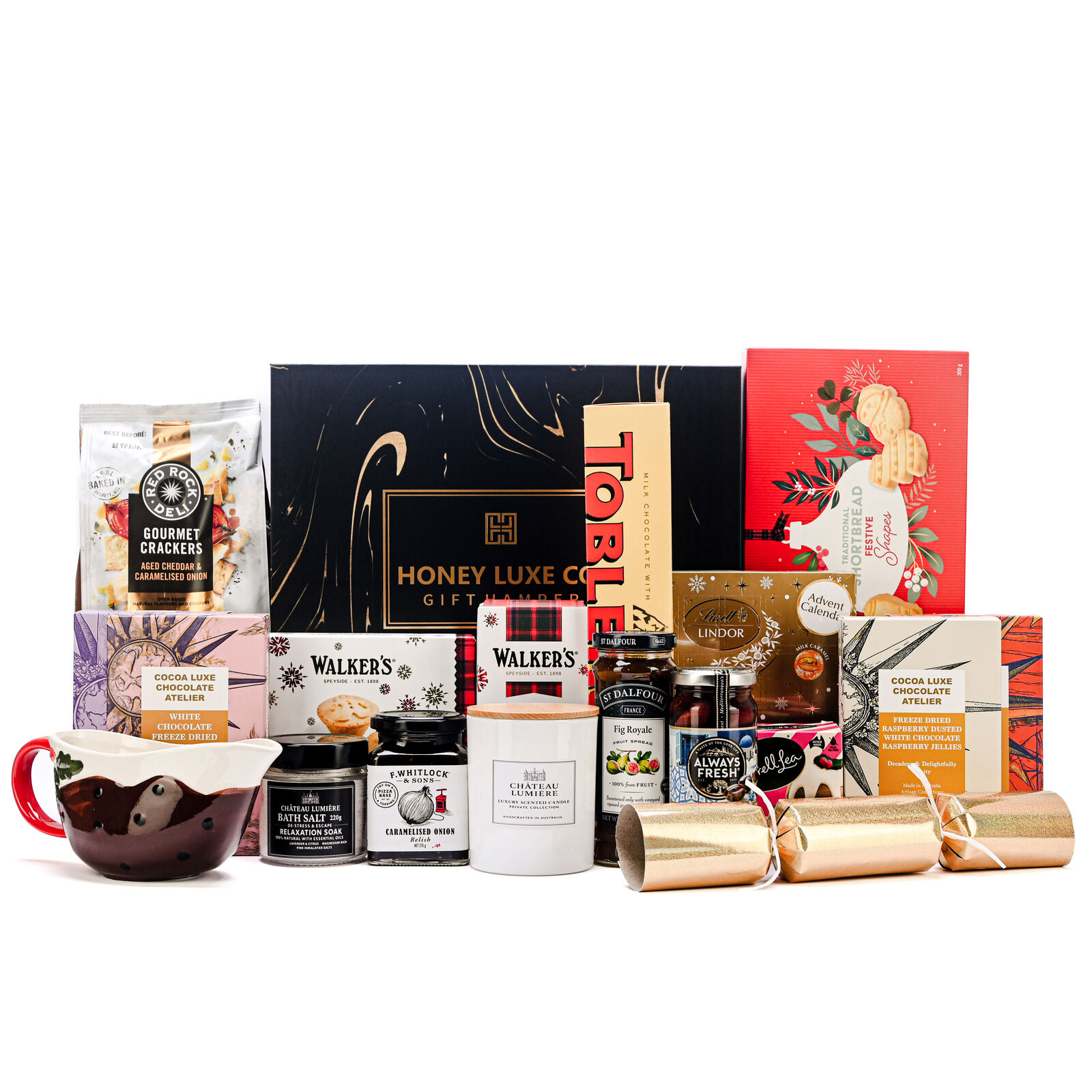 The Grand Luxe Christmas Indulgence Hamper is one of the most decadent festive hampers in the Honey Luxe Co. collection — a generous, joy-filled celebration of Christmas flavours, artisan treats, pampering essentials, and elegant entertaining pieces.