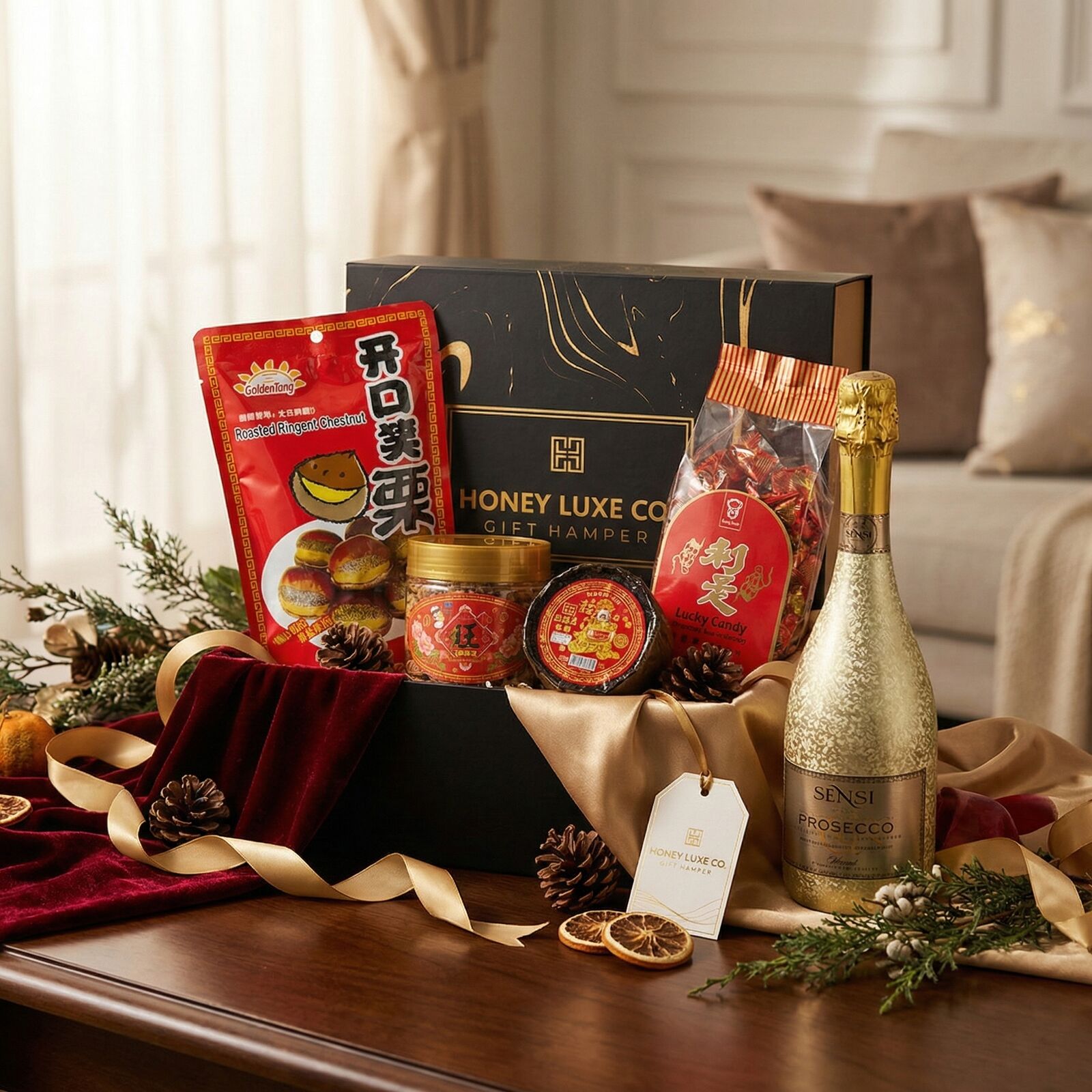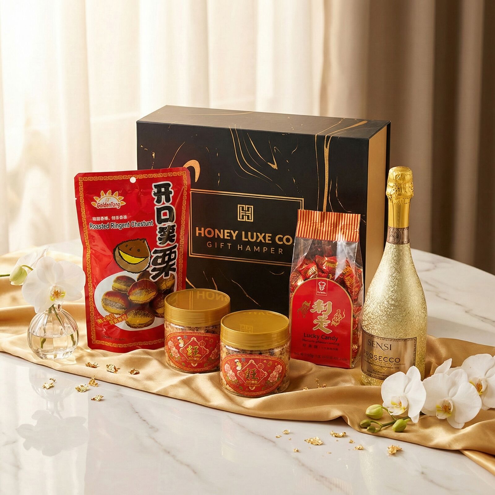 A joyful, contemporary festive collection designed to celebrate prosperity, happiness, and abundance during Lunar New Year. This hamper features traditional favourites including New Year Cake (Nian Gao), Lucky Candy, Roasted Ringent Chestnuts, and Crispy Peanut Puff, each symbolising growth, good fortune, warmth, and prosperity. Paired with Sensi Prosecco DOC 18K Gold, this hamper adds a luxurious golden sparkle—perfect for toasting the New Year with family, friends, or colleagues.