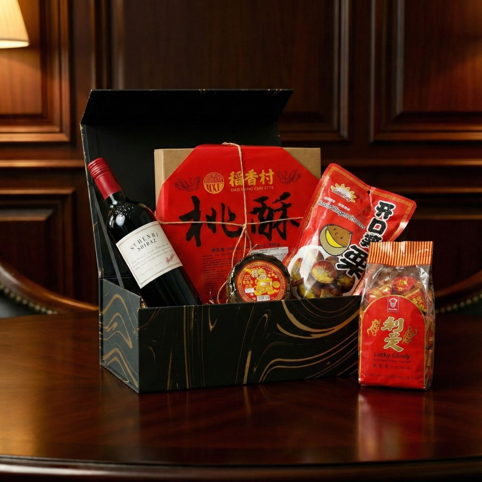 An elegant festive collection designed to honour prosperity, success, and meaningful connections during Lunar New Year. This hamper features traditional favourites such as New Year Cake (Nian Gao), Lucky Candy, Roasted Ringent Chestnuts, and Traditional Crisp Cake Cookies, each symbolising growth, happiness, and togetherness.Paired with Penfolds St Henri Shiraz, this premium hamper is ideal for executive gifting and celebrating Lunar New Year with family, friends, or valued clients.