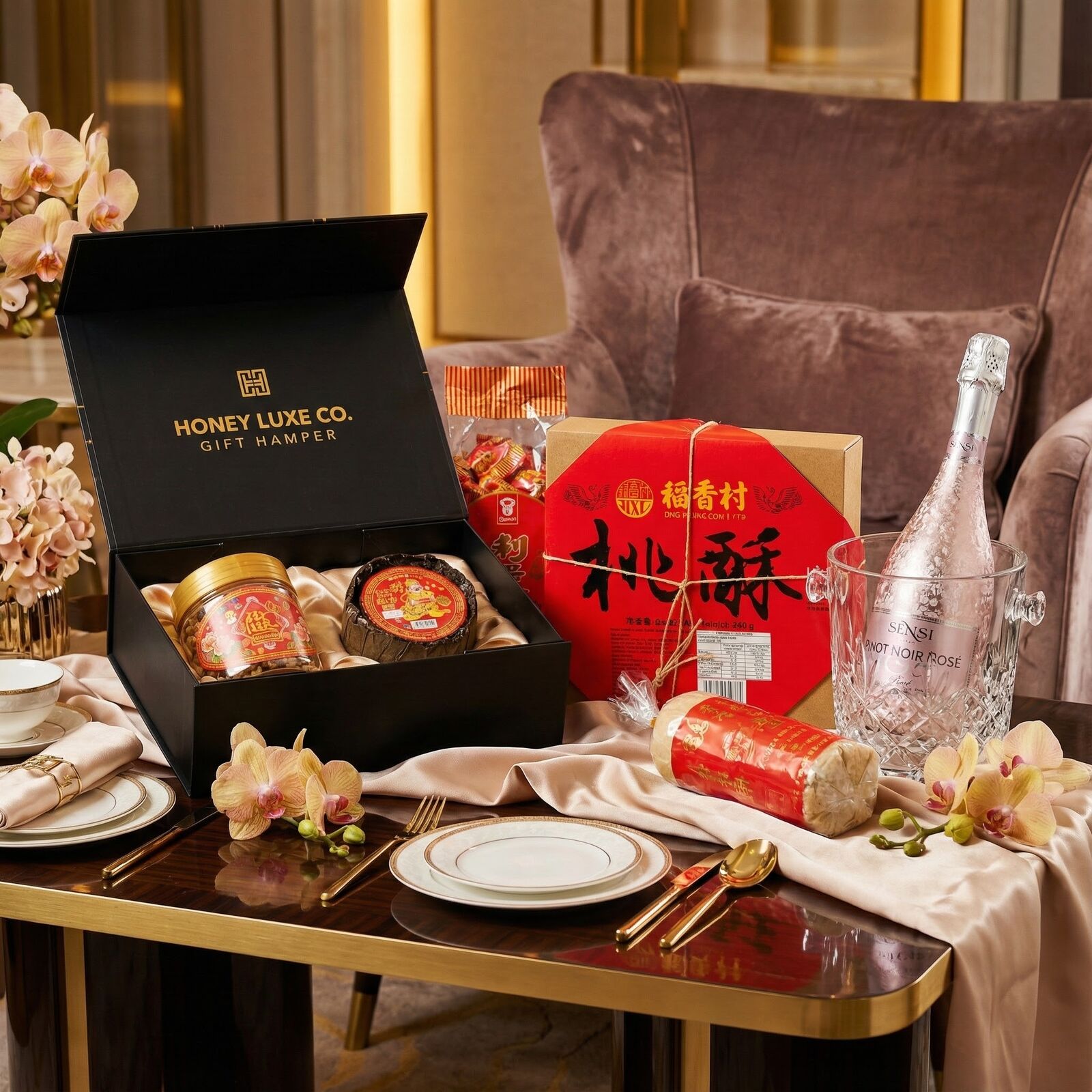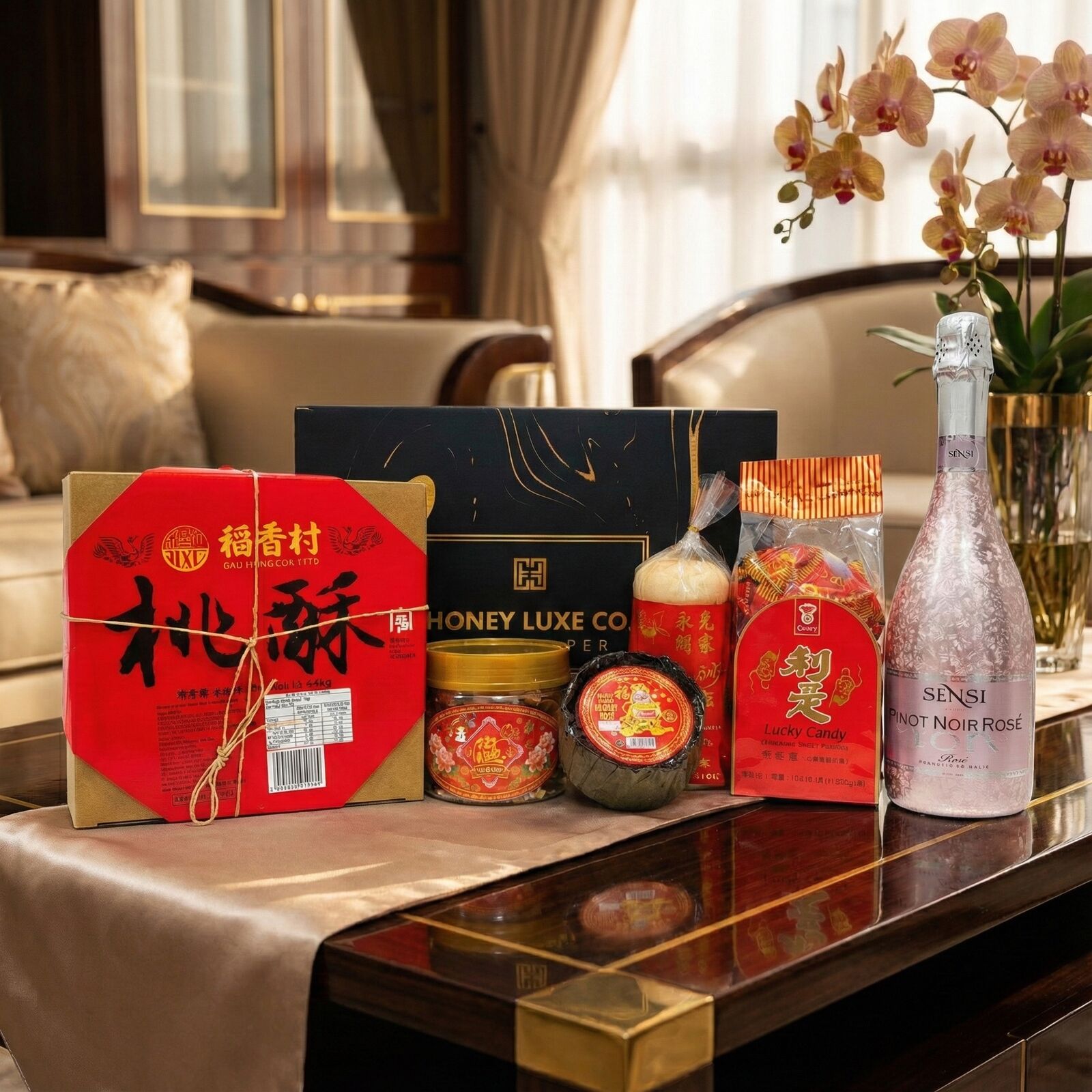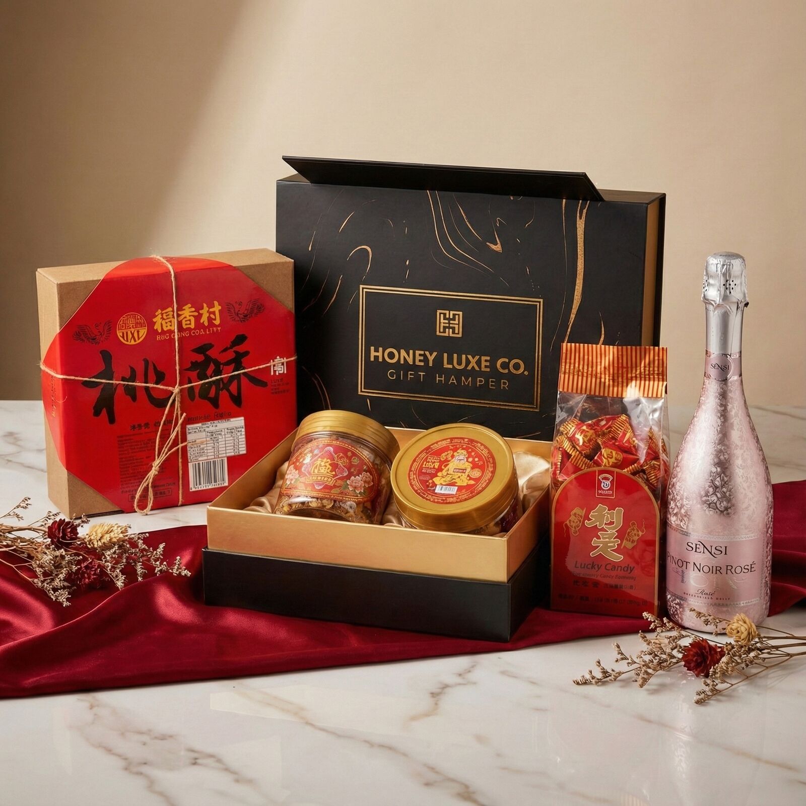 A joyful, contemporary festive collection designed to celebrate prosperity, happiness, and new beginnings during Lunar New Year. This hamper features traditional favourites including New Year Cake (Nian Gao), Lucky Candy, Traditional Crisp Cake Cookies, Crispy Peanut Puff, and Bean Paste Cake, each symbolising growth, good fortune, unity, abundance, and harmony. Paired with Sensi Pinot Noir Rosé 18K Gold Prosecco Rosé, this hamper adds a refined rosé sparkle—perfect for toasting the New Year with family, friends, or colleagues.