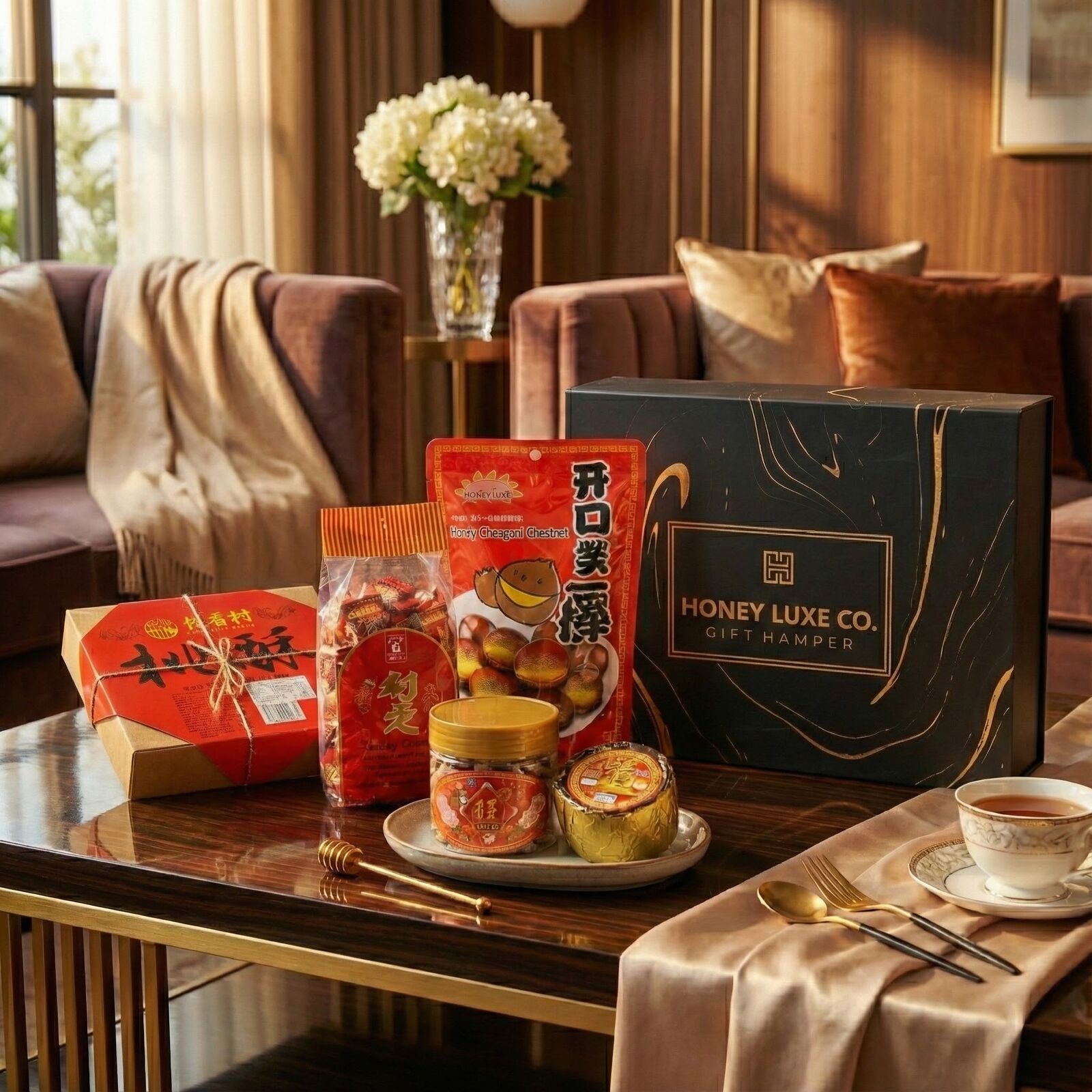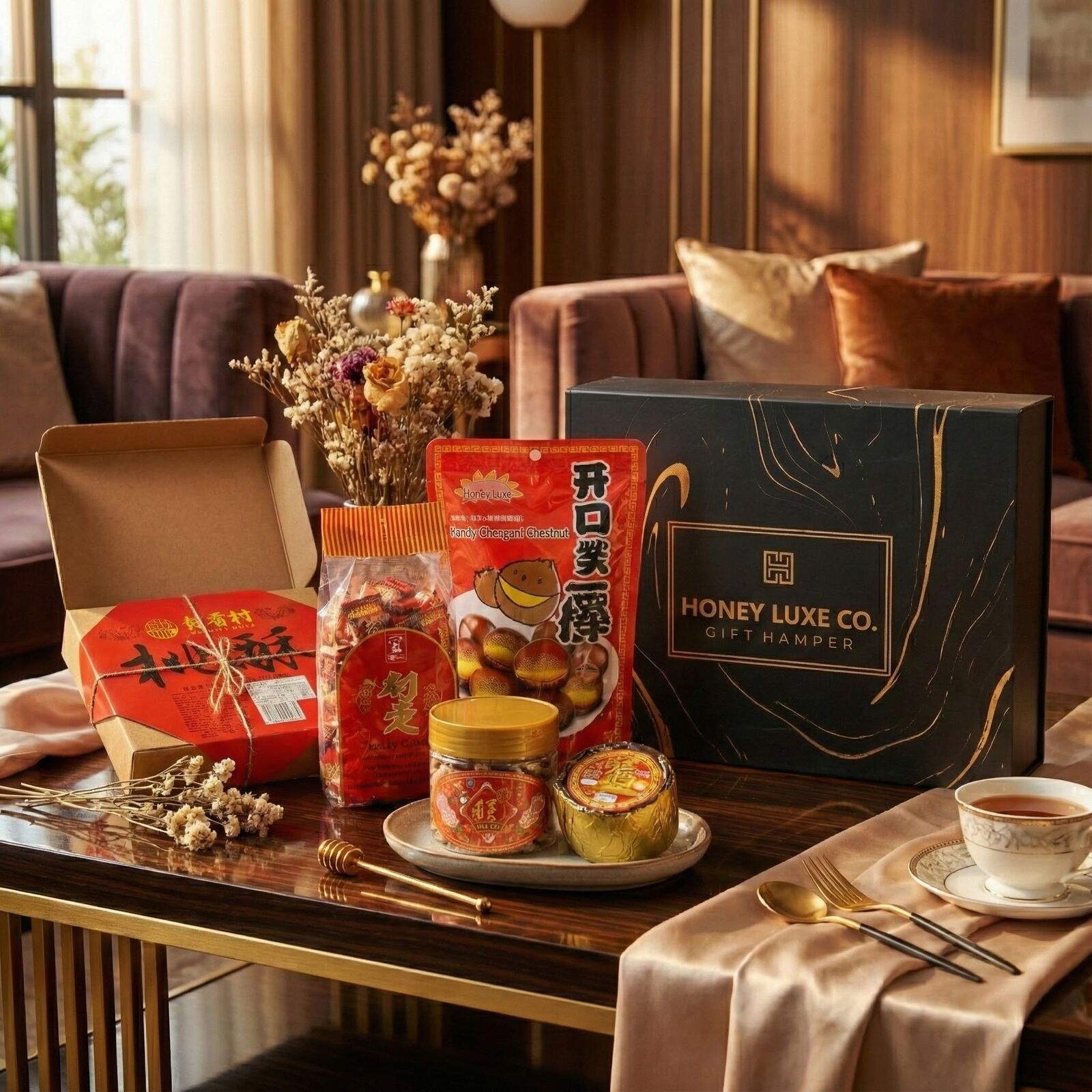 A meaningful festive collection curated to celebrate prosperity, happiness, and togetherness during Lunar New Year. This hamper brings together a selection of much-loved traditional favourites, including Traditional New Year Cake (Nian Gao) symbolising growth and progress, Lucky Candy representing happiness and good fortune, Roasted Ringent Chestnuts for warmth and comfort, Traditional Crisp Cake Cookies shared as a symbol of joy and unity, Crispy Peanut Puff for abundance, and Bean Paste Cake symbolising harmony and sweetness.