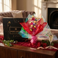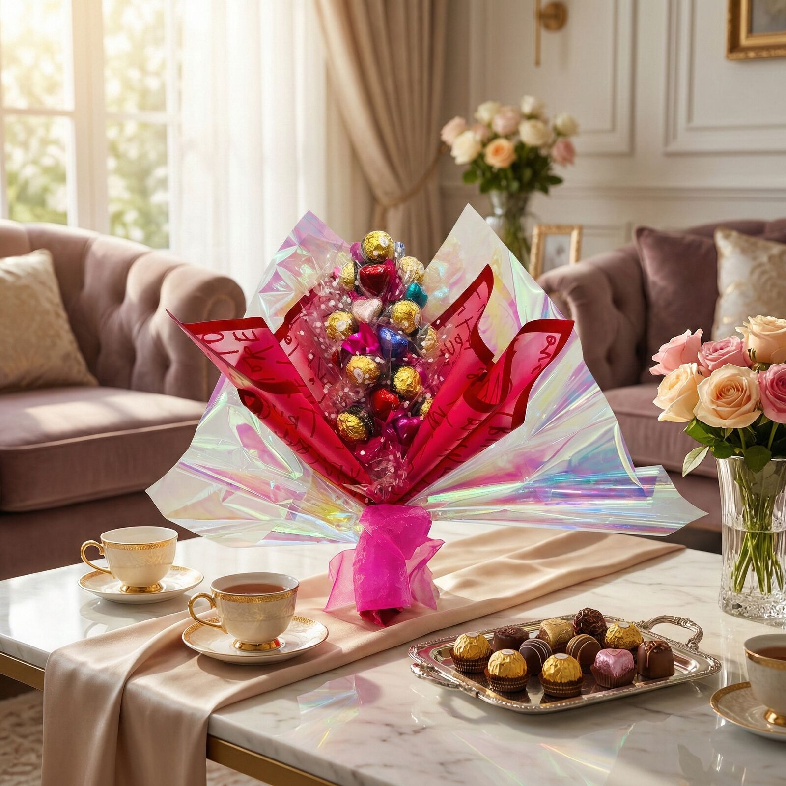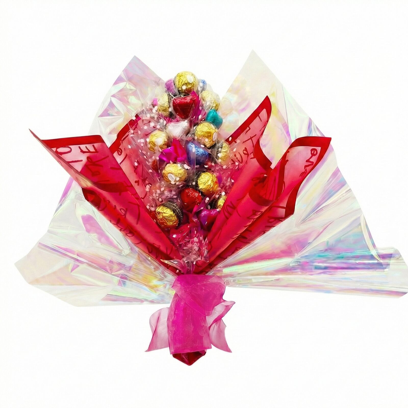 A bold and glamorous alternative to traditional flowers, designed to impress from the very first glance. Hand-arranged with an assortment of premium wrapped chocolates, this bouquet is finished with striking iridescent wrapping, romantic red accents, and a soft ribbon tie. The layered presentation creates a dazzling, high-impact gift that feels both playful and luxurious.