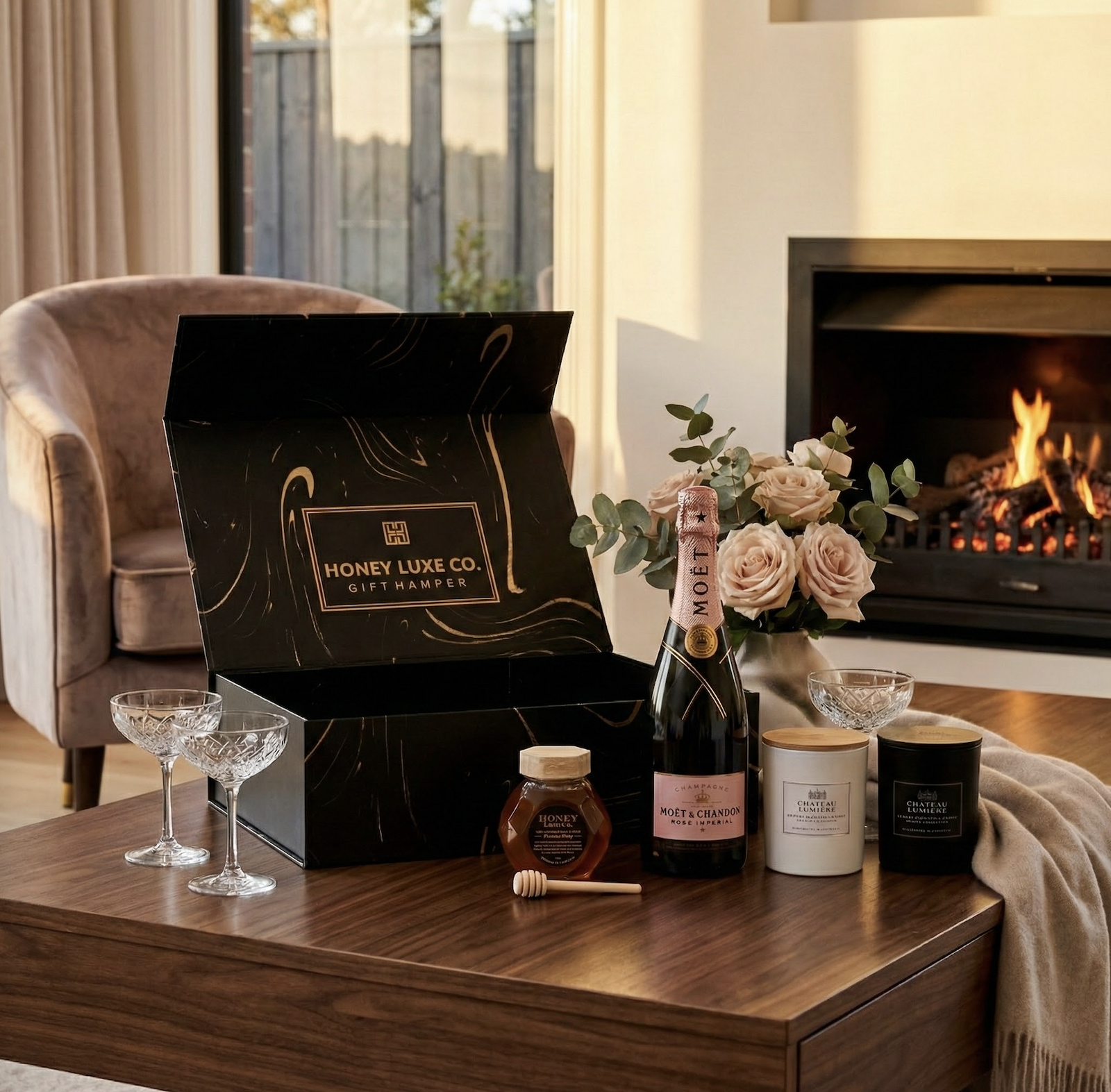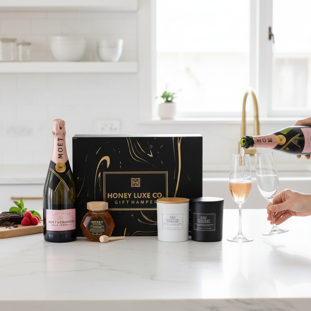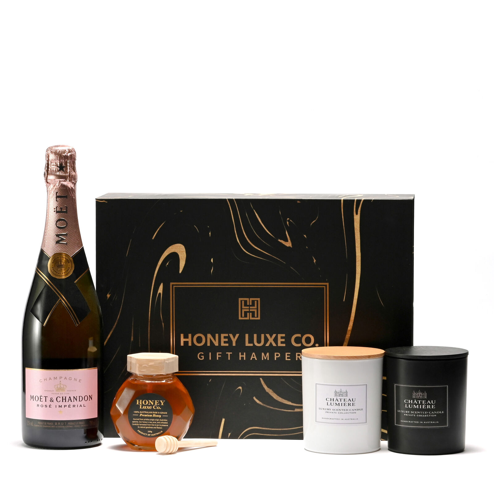 Presented in a Honey Luxe Co. Luxury Gift Box with a complimentary gift card, the Moët & Chandon Rosé Candle Duo Hamper is an exquisite expression of elegance, warmth, and modern romance — perfect for anniversaries, weddings, and high-end corporate gifting.