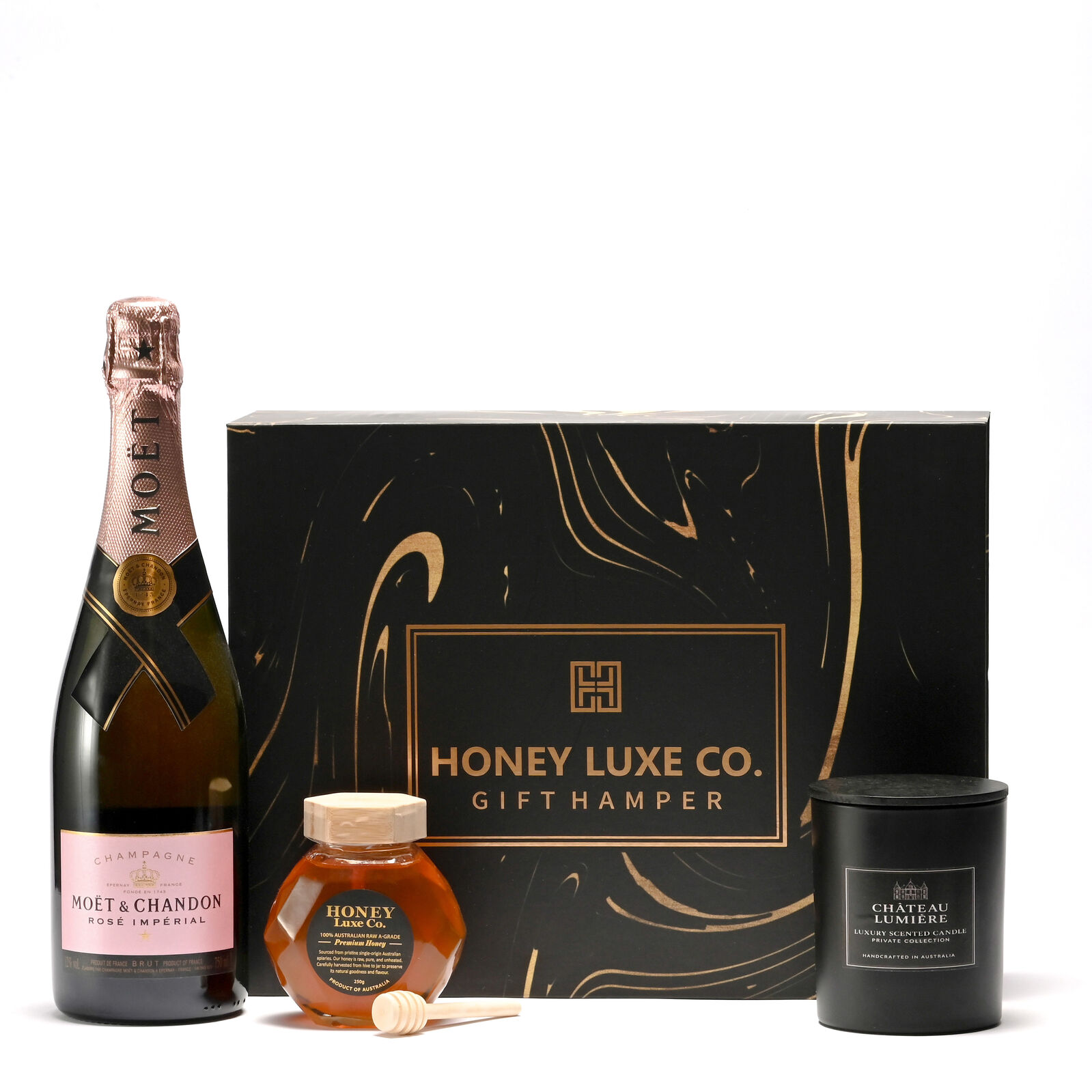 The Moët & Chandon Rosé Harmony Hamper is a radiant celebration of elegance and warmth. A bottle of Moët & Chandon Rosé Impérial — with its vibrant pink hue and notes of strawberry, raspberry, and rose petals — takes centre stage, perfectly complemented by 100% Australian RAW A-Grade Premium Honey (250 g) and a Château Lumière Luxury Scented Soy & Coconut Wax Candle (Large). This exquisite pairing of sparkle, sweetness, and serenity creates an indulgent experience that feels both luxurious and heartfelt.