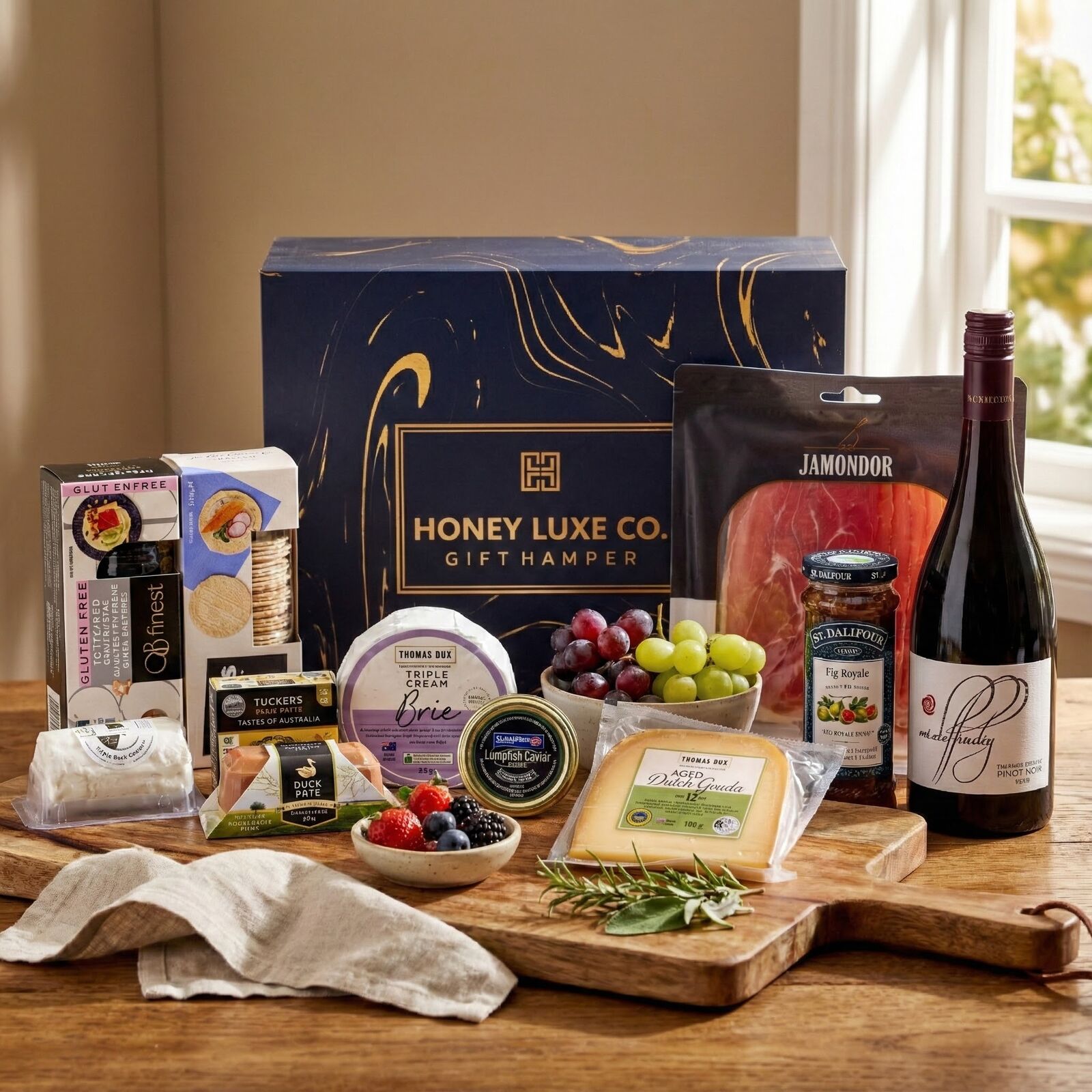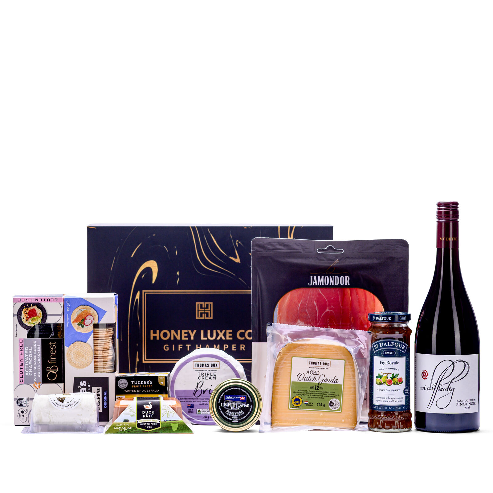 A premium savoury grazing experience curated for refined entertaining, executive gifting, and milestone celebrations. Featuring Mt Difficulty Pinot Noir from Central Otago, New Zealand, this elegant cool-climate red wine showcases vibrant red berry fruit, subtle spice, and silky tannins — an exceptional match for fine cheeses and gourmet savoury selections. This hamper includes Tasmanian Duck Pâté with Brandy, a trio of artisan cheeses — aged Dutch gouda, triple cream brie and French goat’s cheese — complemented by Serrano sliced ham, black caviar, and refined accompaniments such as St Dalfour Royal Fig and Quince & Wattleseed Fruit Paste. Premium natural and charcoal wafer crackers complete the experience, delivering balance, texture and sophistication.