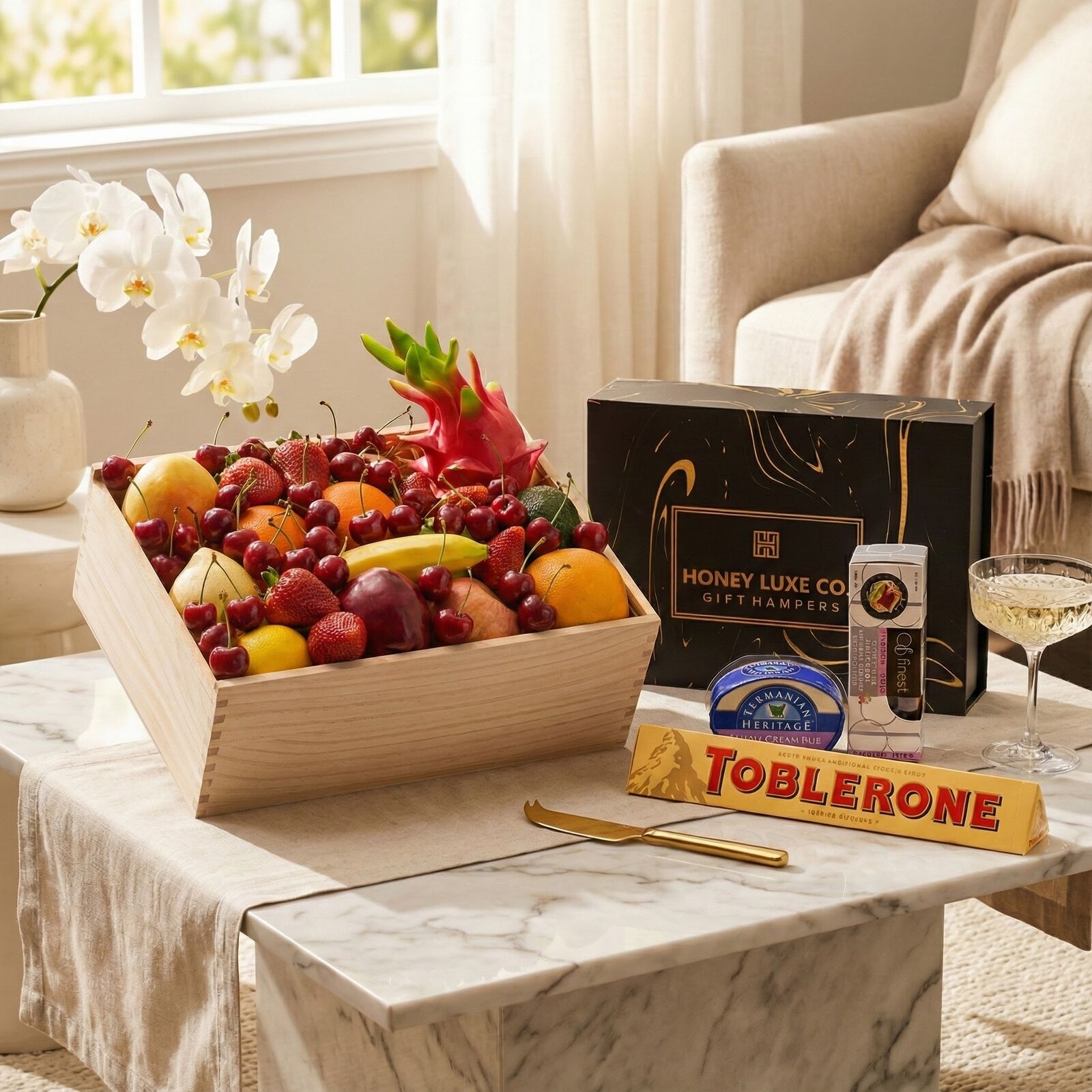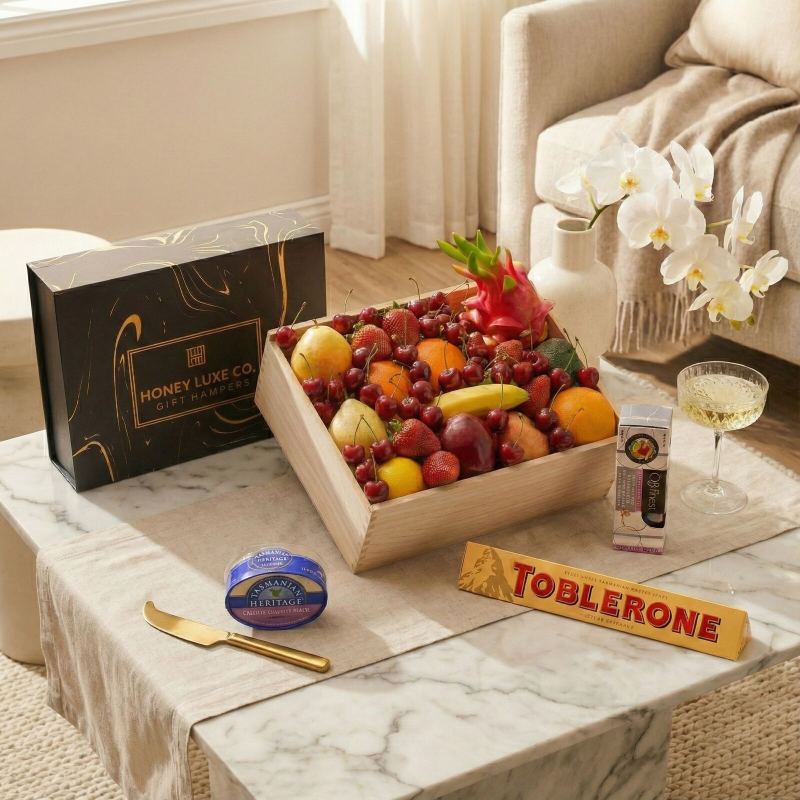 Blends fresh orchard sweetness with rich brie, crisp crackers and indulgent chocolate. Featuring Premium Handpicked Seasonal Fruit paired with Tasmanian Heritage Triple Cream Brie and OB Finest Wafer Crackers, this refined hamper is elevated by the citrus-infused Toblerone Orange Twist for a sweet, luxurious finish — perfect for gifting, entertaining or celebrating special moments. Beautifully presented in a Premium Wooden Gift Box with a complimentary gift card, it offers elegant, well-balanced gourmet indulgence.