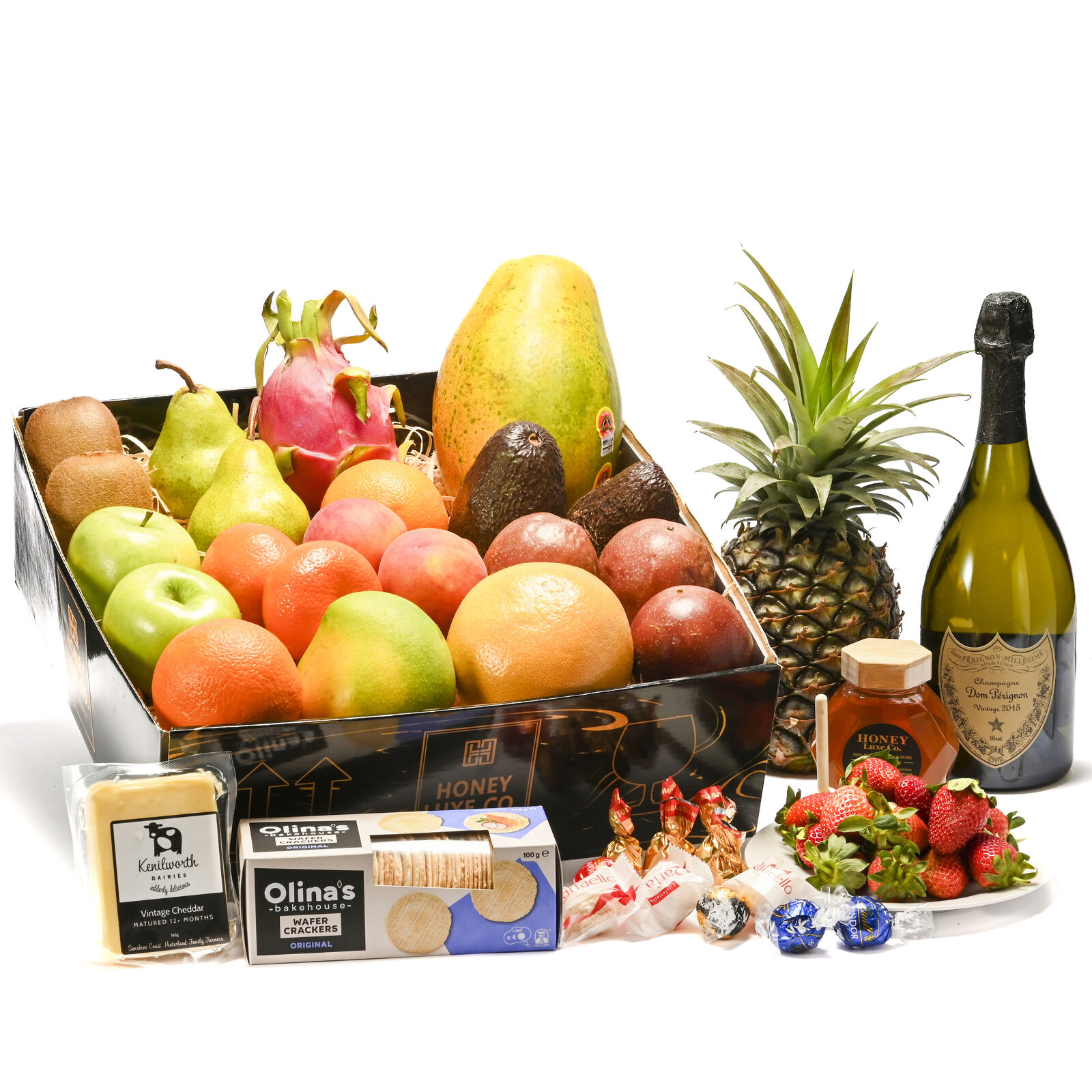 The Orchard Celebration Indulgence Dom Pérignon Edition is the ultimate expression of prestige, refinement, and indulgence. At its heart is the world-renowned Dom Pérignon Vintage Champagne, crafted only from the finest grapes of a single exceptional harvest. Each sip reveals a symphony of brioche, toasted almond, citrus, and stone fruit, with extraordinary depth and balance. Paired with Premium Handpicked Seasonal Fruit, Mixed Signature Chocolates, and 100% Australian RAW A-Grade Premium Honey (250 g), this gift delivers an exquisite combination of flavour and elegance. To complete the experience, Kenilworth Dairies Vintage Cheddar (165 g) and Wafer Crackers Natural offer a savoury contrast — perfect for the most discerning palate.