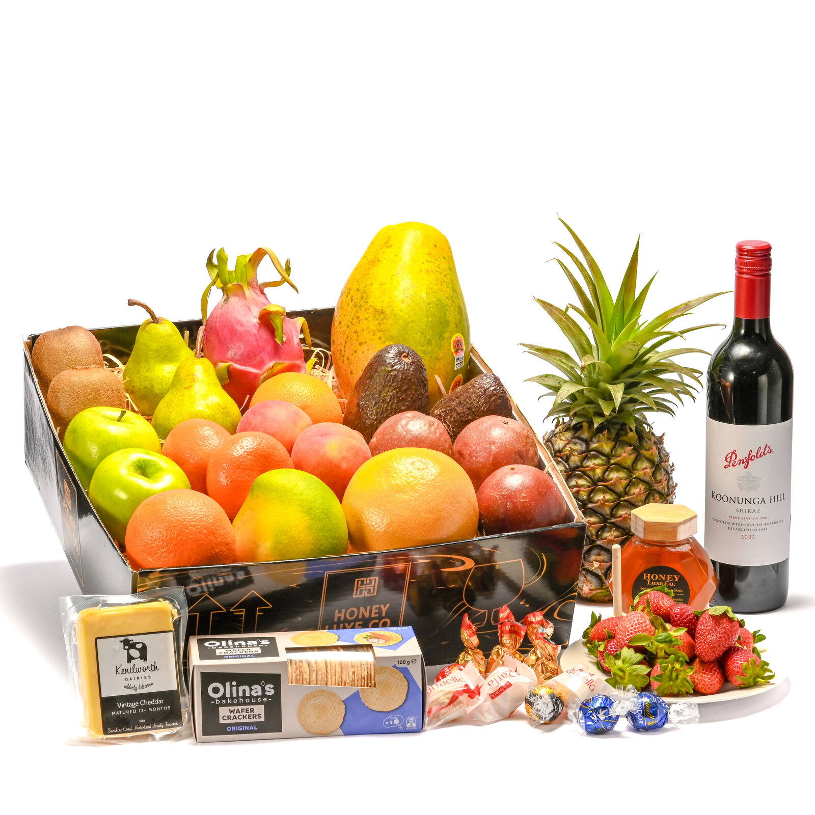 The Orchard Celebration Indulgence Red Wine Edition is an elegant gourmet experience, crafted for those who appreciate bold flavours and refined indulgence. A bottle of Penfolds Koonunga Hill Shiraz Cabernet anchors this luxurious hamper, offering rich notes of dark berries, plum, and spice, perfectly balanced with smooth oak undertones. It’s paired with Premium Handpicked Seasonal Fruit, Mixed Signature Chocolates, and 100% Australian RAW A-Grade Premium Honey (250 g) for natural sweetness. Finishing the experience, Vintage Cheddar Cheese and Wafer Crackers Natural create the perfect savoury pairing — a sophisticated balance of flavour and texture.