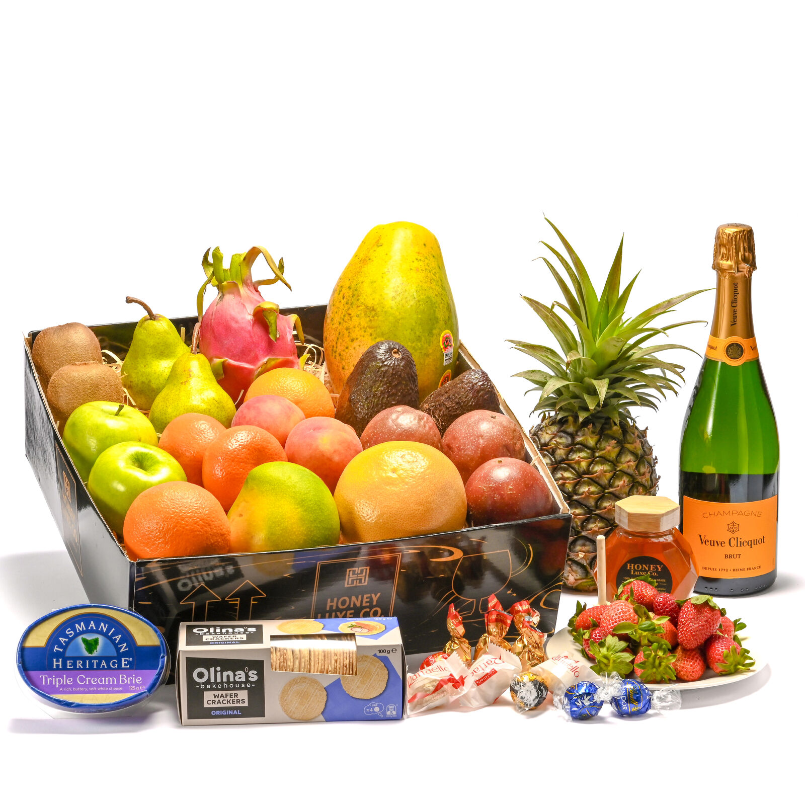 A refined blend of freshness and luxury, featuring Veuve Clicquot Yellow Label Brut NV with elegant notes of brioche, peach and citrus. Paired with premium seasonal fruit, Ferrero Rocher Chocolate Gift Box, 100% Australian RAW A-Grade honey, rich triple cream brie and natural wafer crackers, it offers a beautifully balanced experience of sweetness, texture and celebratory sparkle.