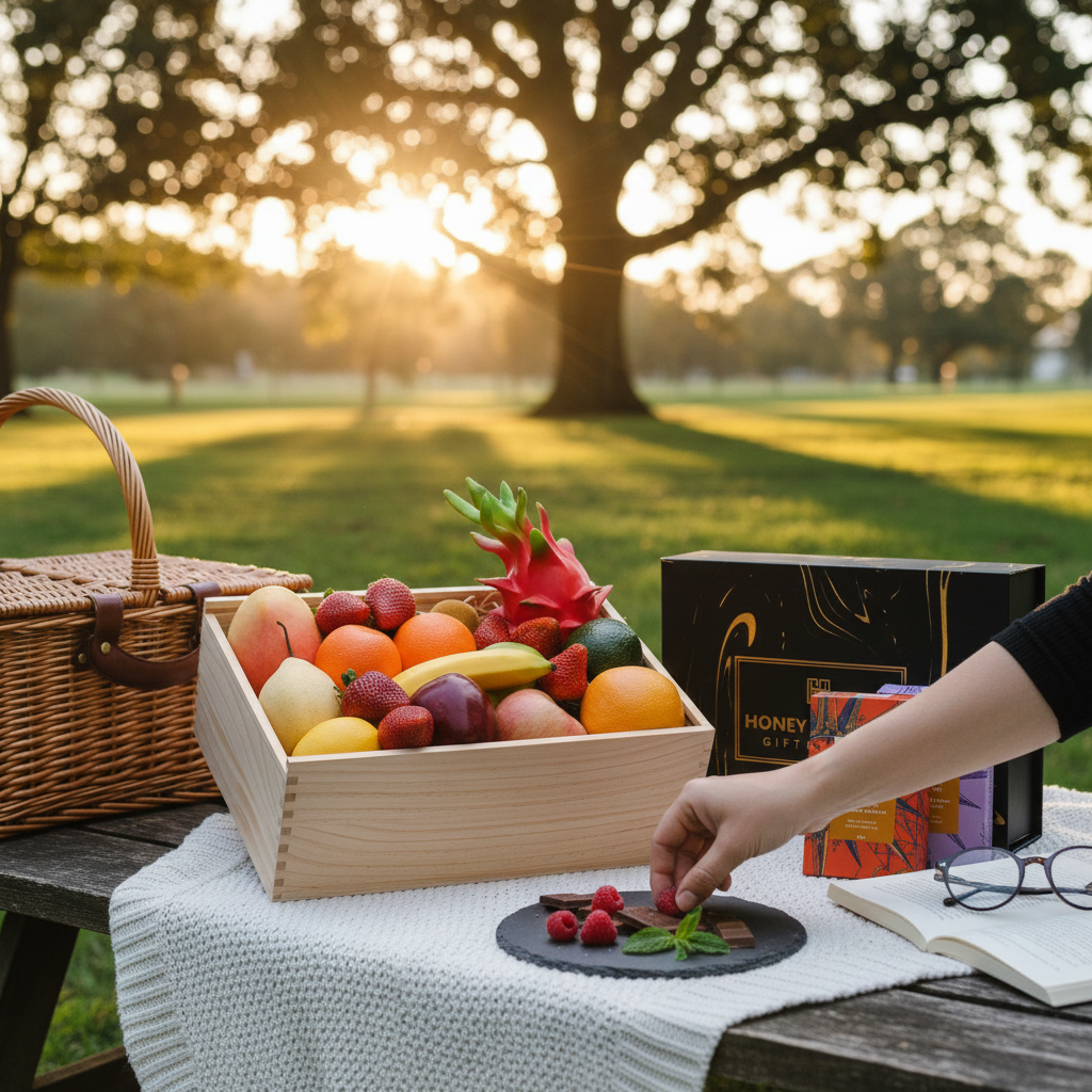 Blends fresh orchard sweetness with rich, indulgent chocolate treats. Featuring Premium Handpicked Seasonal Fruitpaired with Coffee & Dark Chocolate Bliss and Golden Caramel Chocolate Popcorn, this deliciously balanced hamper offers natural vibrancy, deep cocoa richness and sweet caramel crunch — perfect for birthdays, thank-yous, staff appreciation or thoughtful everyday gifting. Beautifully presented in a Premium Wooden Gift Box with a complimentary gift card, it delivers simple, refined indulgence in one.