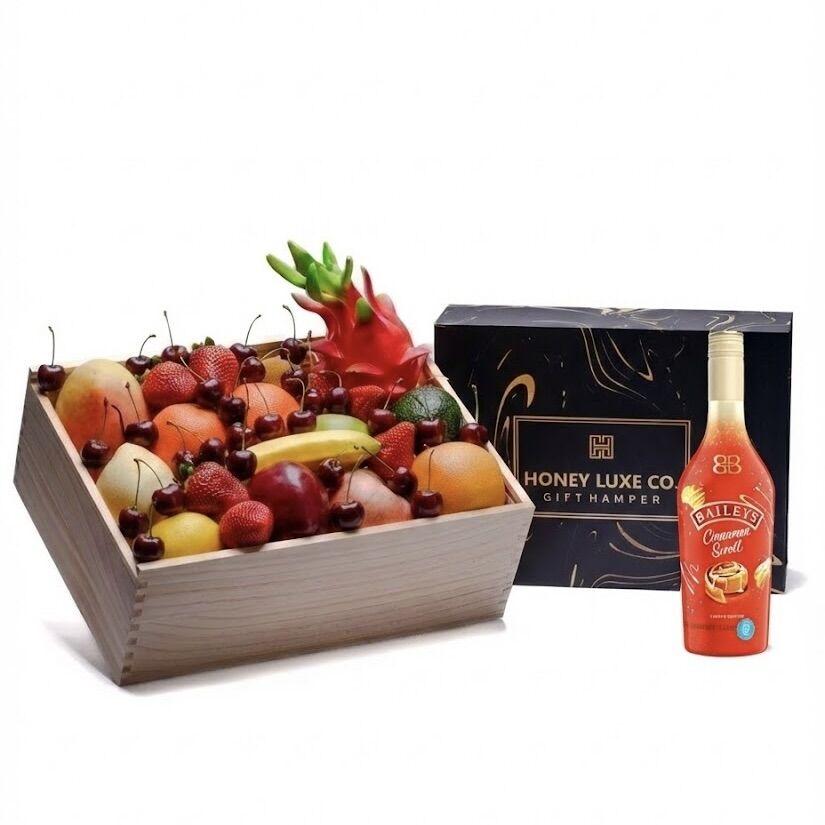 A warm, nostalgic gift pairing premium handpicked seasonal fruit with the comforting richness of Baileys Cinnamon Scroll Liqueur. Blending smooth Irish cream, fine whiskey and gentle cinnamon spice with subtle pastry sweetness, this indulgent liqueur beautifully complements the fresh vibrancy of seasonal fruit for a cosy, dessert-style experience.