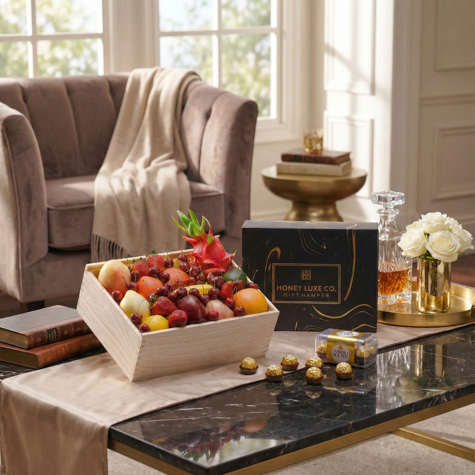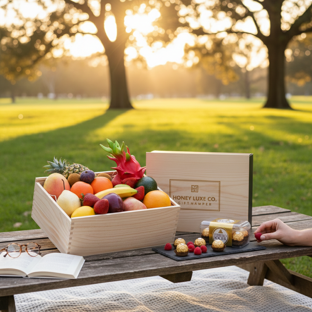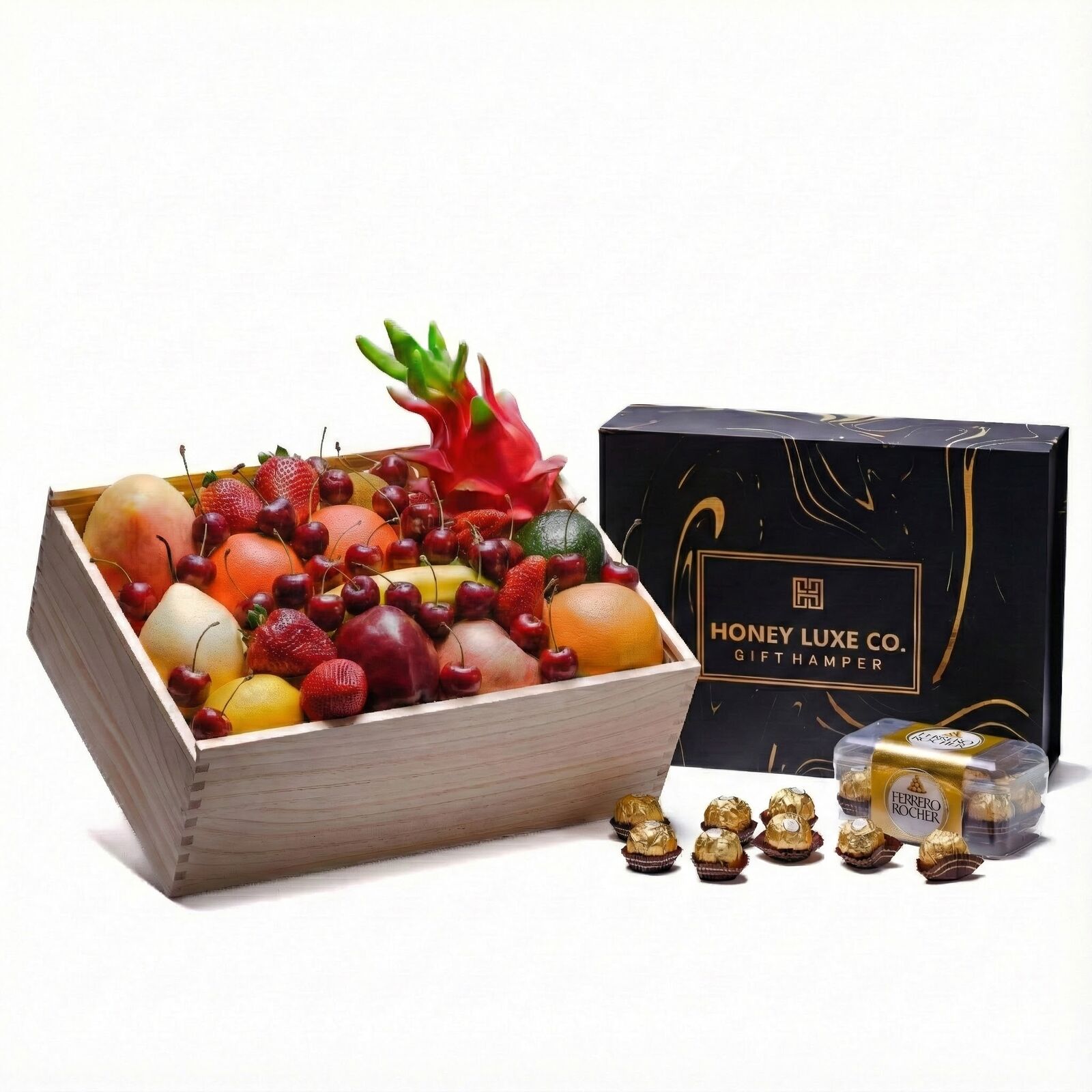 Blends fresh orchard sweetness with golden chocolate indulgence. Featuring Premium Handpicked Seasonal Fruit for vibrant flavour and natural freshness, paired with a Ferrero Rocher Chocolate Gift Box for its classic hazelnut, crisp wafer and smooth milk chocolate elegance, this hamper is perfect for thank-yous, birthdays, corporate appreciation or thoughtful everyday gifting. Beautifully presented in a Premium Wooden Gift Box with a complimentary gift card, it offers a simple, luxurious and uplifting gifting experience.