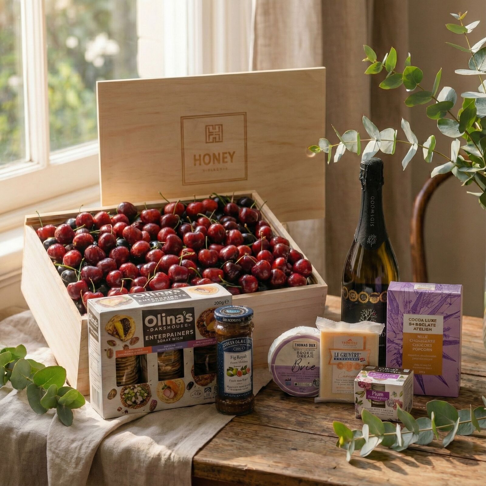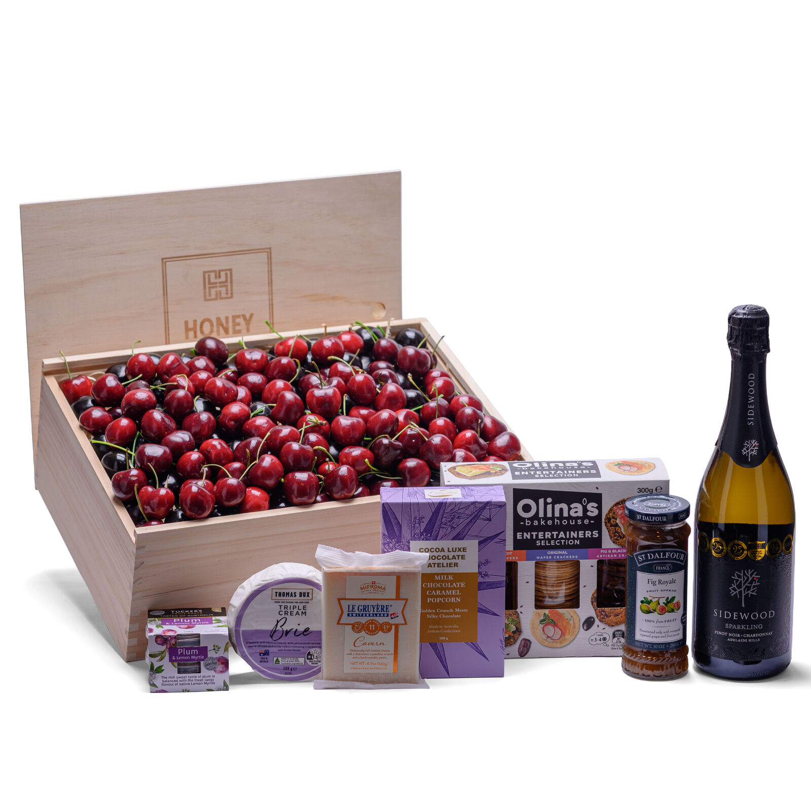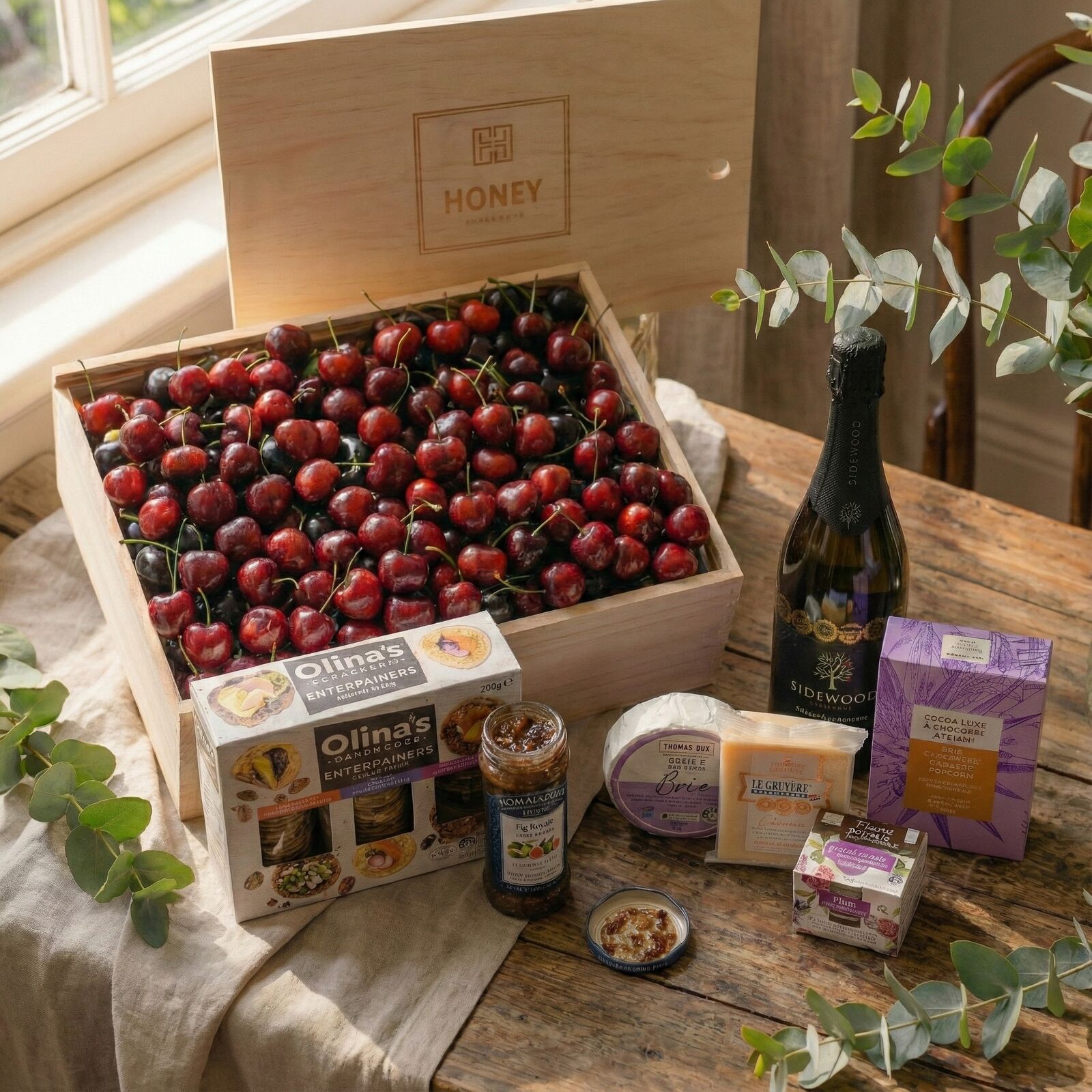 A refined gourmet experience built around orchard-fresh cherries and elegant Australian sparkling wine. Featuring Premium Handpicked Cherries, this hamper delivers exceptional sweetness, bold colour and fresh seasonal luxury — ideal for celebrations and entertaining. The hamper includes a thoughtfully curated selection of gourmet accompaniments
