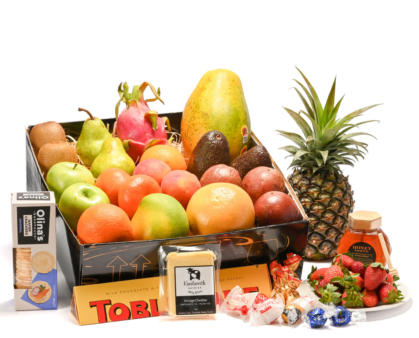 The Orchard Luxe Delight Hamper is a radiant celebration of freshness and indulgence. Presented in a large Honey Luxe Co. luxury gift box, it features a generous selection of fresh seasonal fruits, paired with a Toblerone Orange Twist Milk Chocolate Bar (360 g), Mixed Signature Chocolates and a jar of 100% Australian RAW A-Grade Premium Honey (250 g). For a savoury balance, we’ve replaced Maggie Beer cheeses with a premium Vintage Cheddar — smooth, full-bodied, and crafted for gourmet pairing. Finished with Wafer Crackers Natural, this hamper brings together the best of fresh, sweet, and savoury.