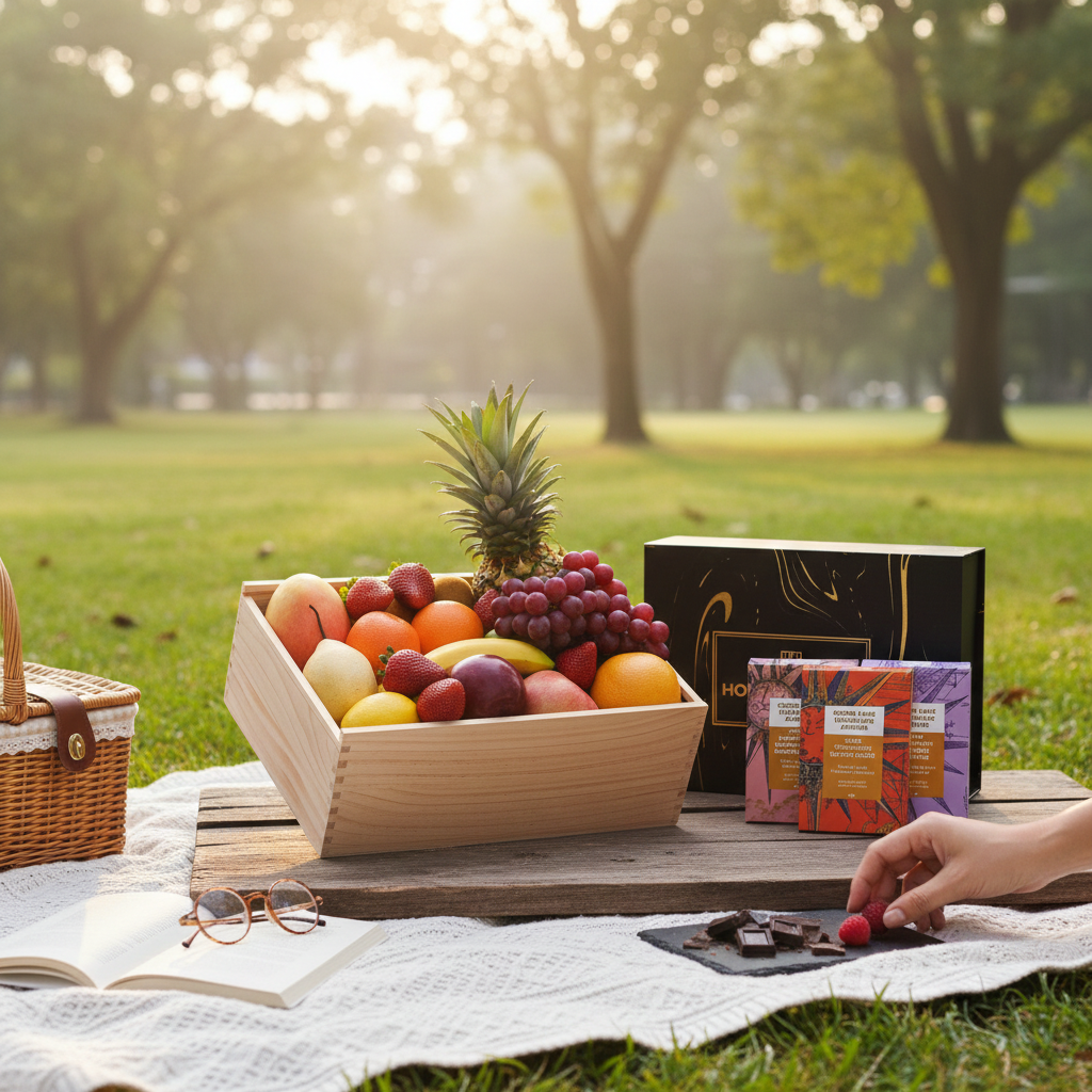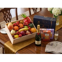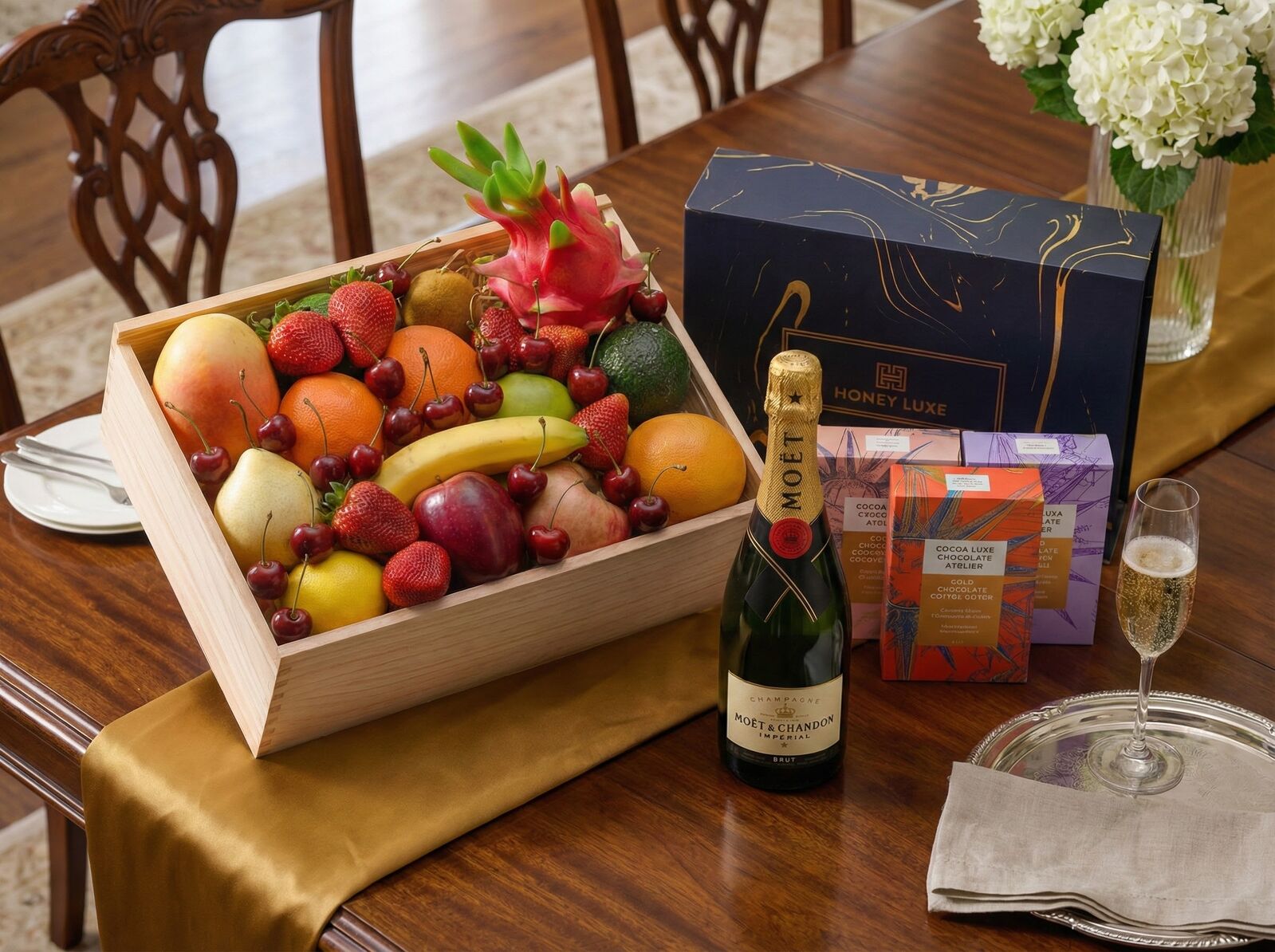 Celebration Hamper brings together fresh handpicked fruit, gourmet chocolates and world-class champagne. Featuring Premium Handpicked Seasonal Fruit, paired with Coffee & Dark Chocolate Bliss, Golden Caramel Popcorn and White Chocolate Strawberry Bliss, it offers a perfect mix of freshness, richness and sweetness. The highlight is Moët & Chandon Impérial Brut, with bright citrus, apple and brioche notes — a perfect sparkling match for fruit and chocolate.