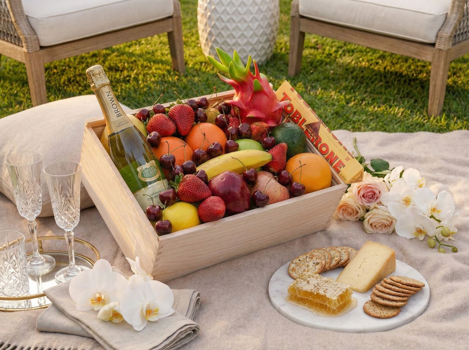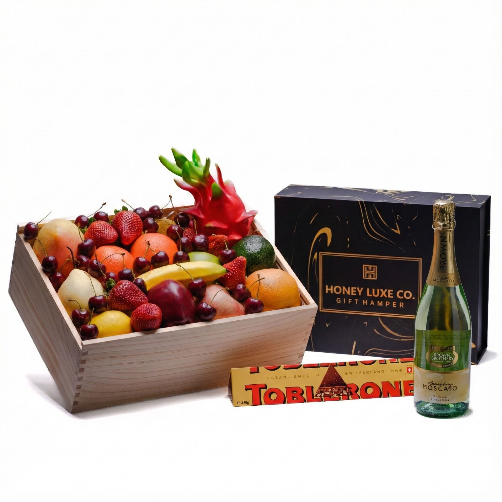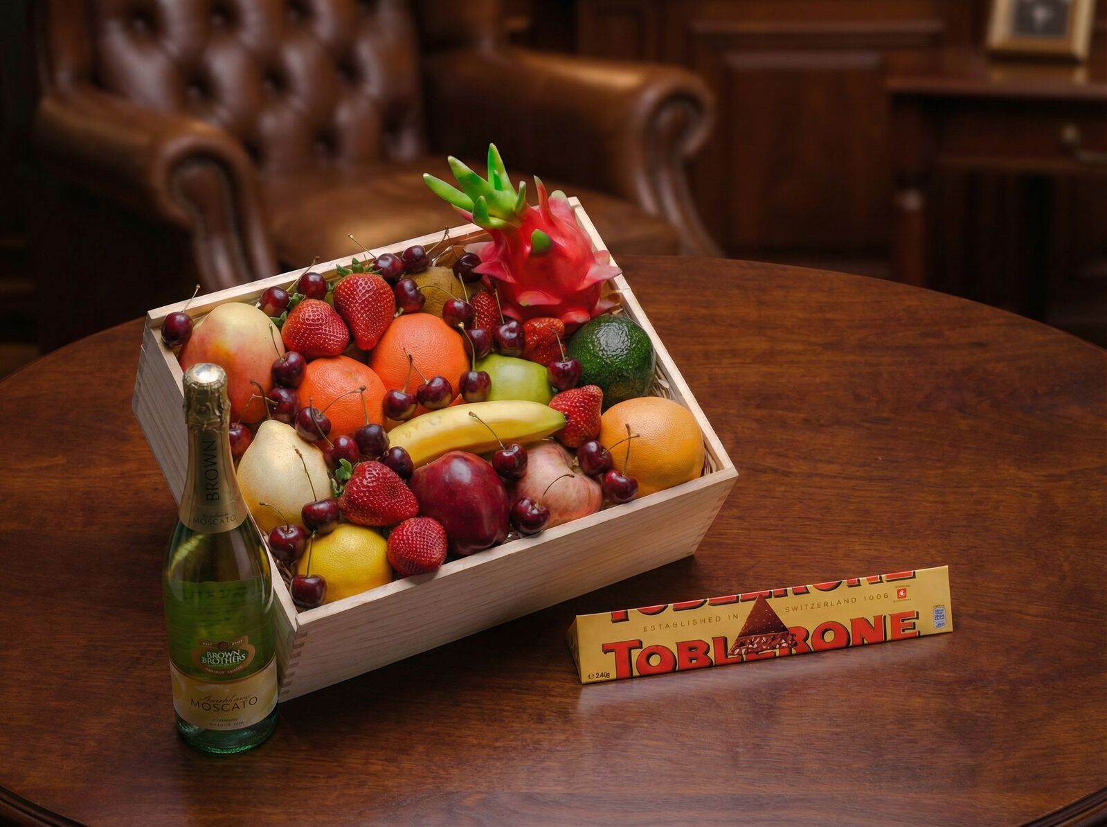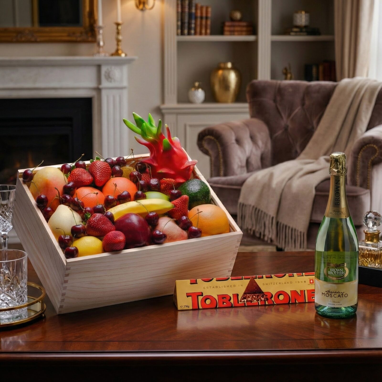 Blends fresh seasonal fruit, sweet sparkling wine and indulgent Swiss chocolate for a vibrant, celebratory gifting experience. At its heart is a generous selection of Premium Handpicked Seasonal Fruit, chosen at peak ripeness for exceptional flavour, colour and freshness.
