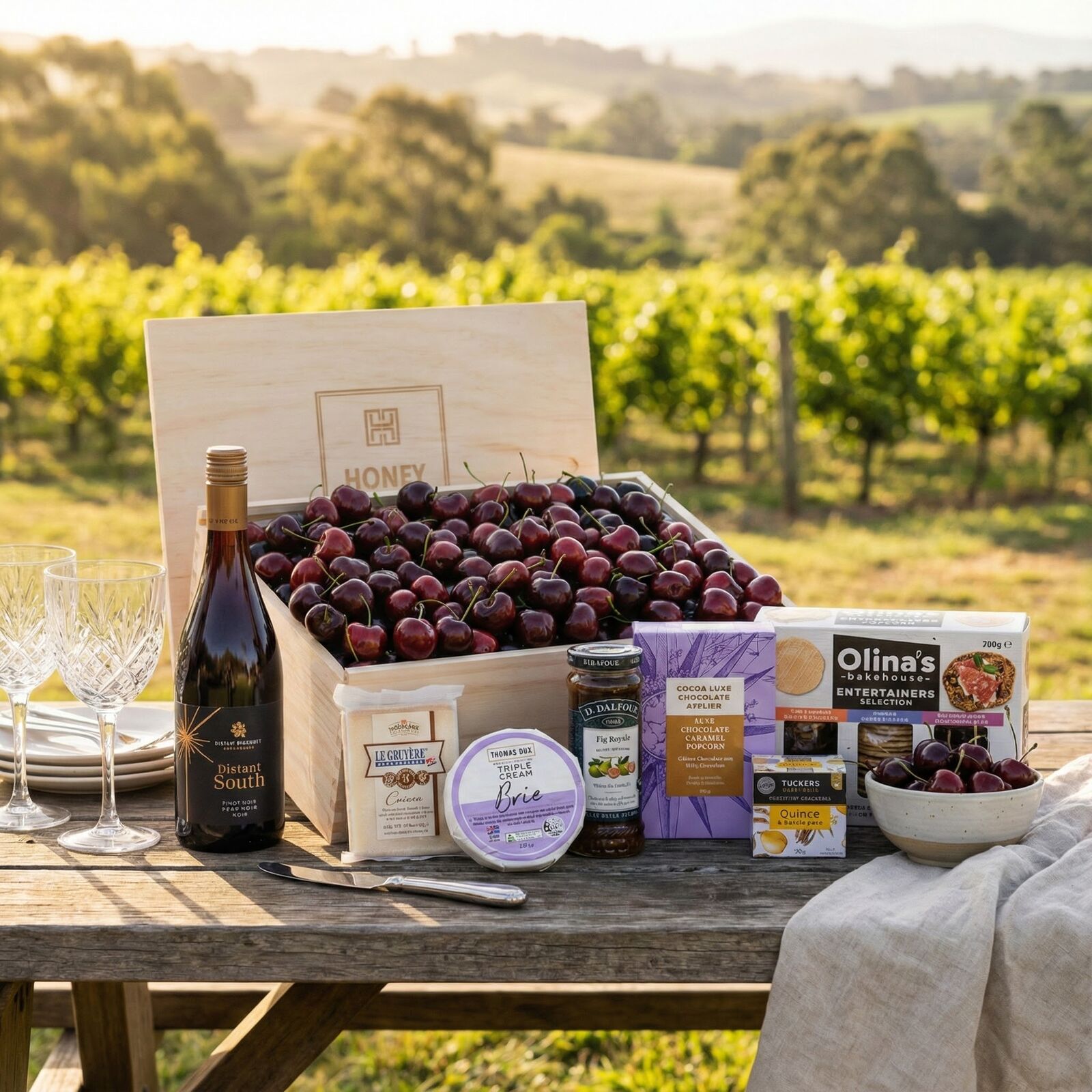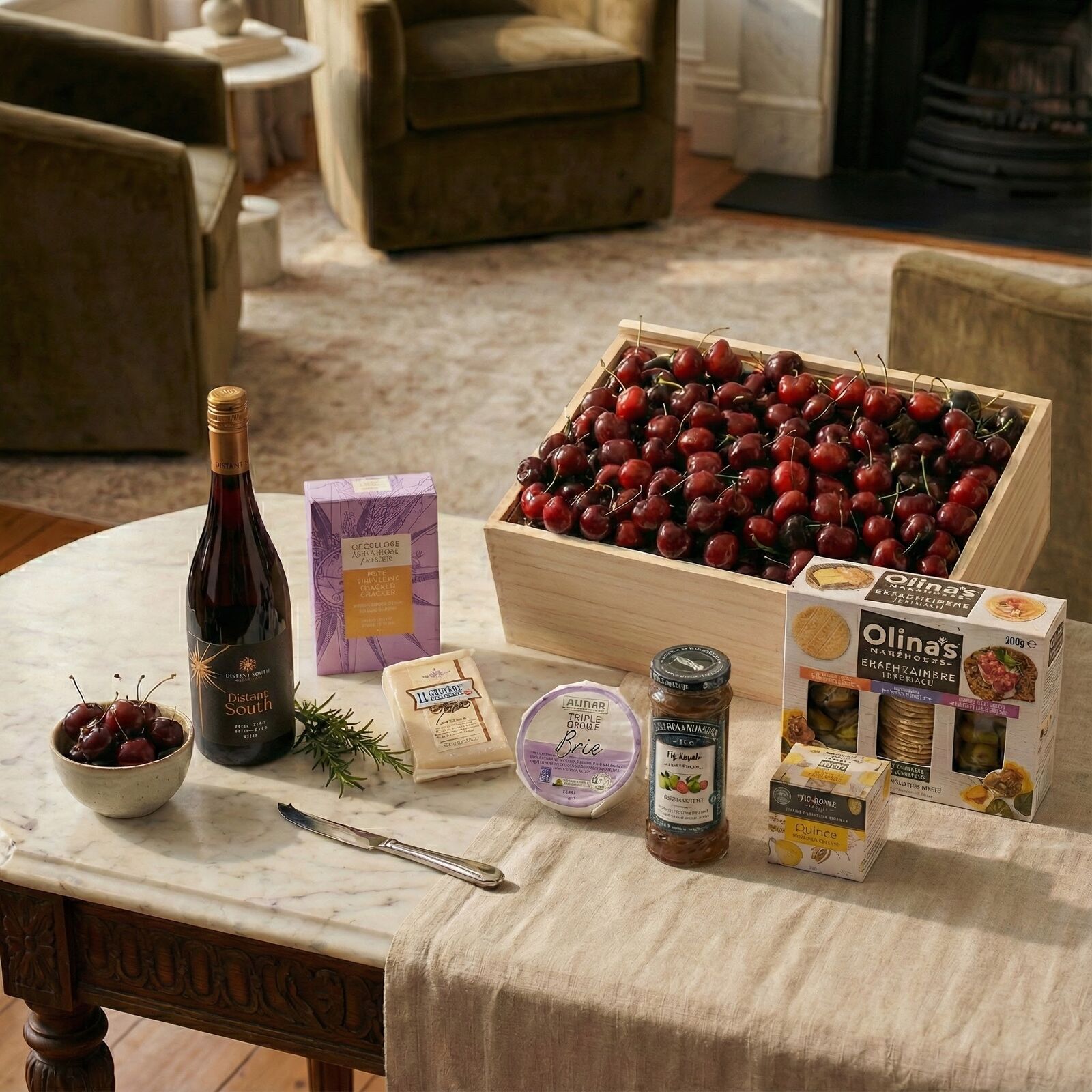 A refined gourmet gifting experience that celebrates the harmony of premium seasonal fruit, artisan cheeses and elegant Pinot Noir. Showcasing Premium Handpicked Cherries, this hamper delivers vibrant colour, exceptional sweetness and orchard-fresh quality — a stunning highlight for grazing and gourmet entertaining.