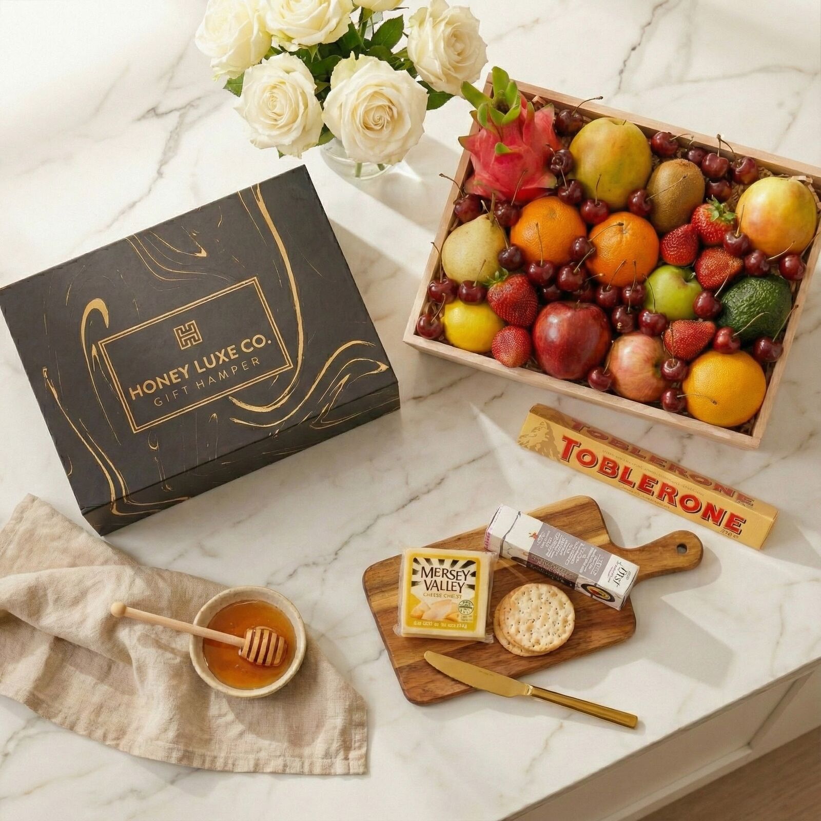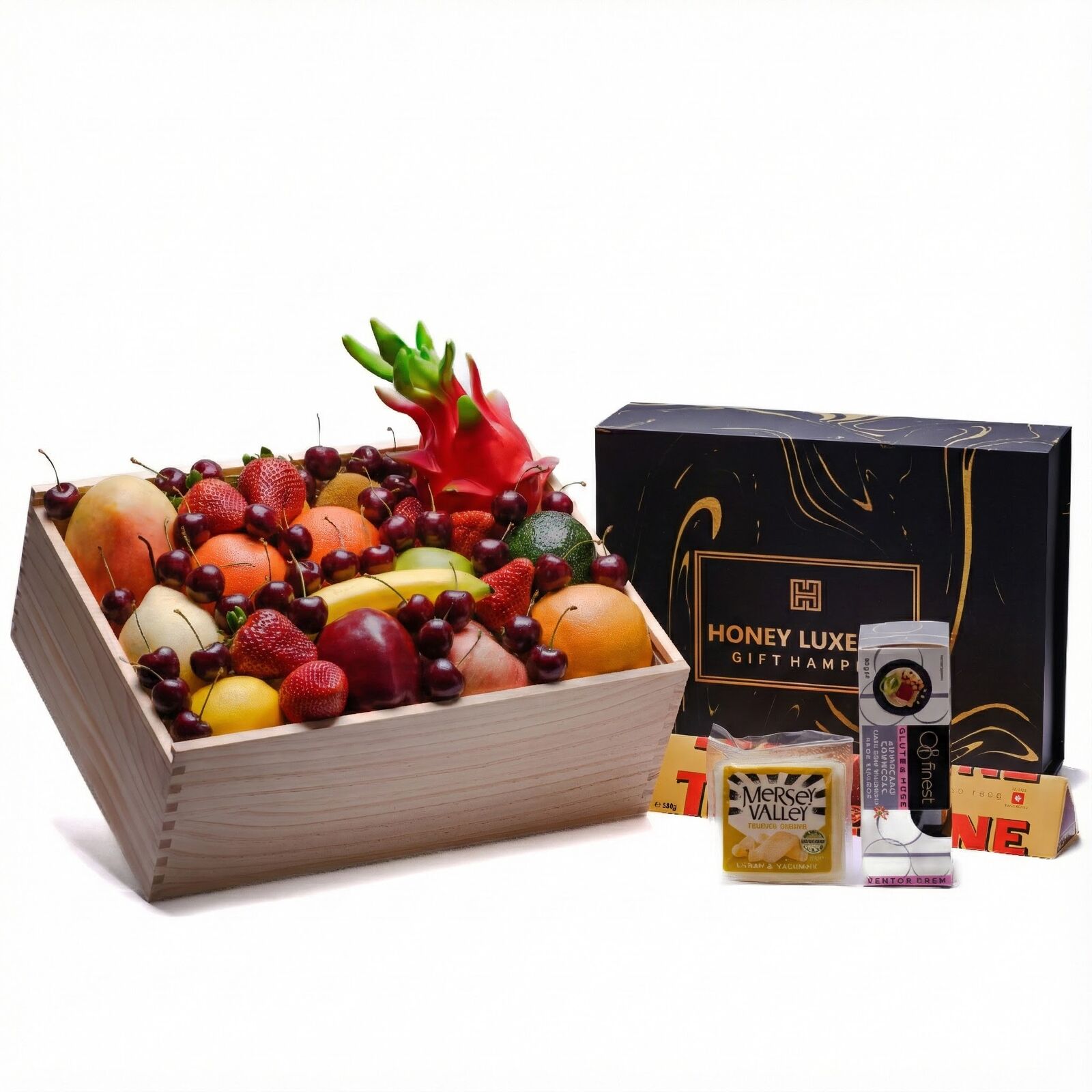 Blends fresh orchard sweetness with bold savoury indulgence and premium chocolate. Featuring Premium Handpicked Seasonal Fruit paired with Mersey Valley Pickled Onion Cheddar and OB Finest Wafer Crackers, this flavour-rich hamper is elevated by the citrus-infused Toblerone Orange Twist for a luxurious sweet finish — perfect for settlement gifts, housewarmings, birthdays, thank-yous or corporate gifting. Beautifully presented in a Premium Wooden Gift Boxwith a complimentary gift card, it offers a dynamic and elegant gourmet experience.