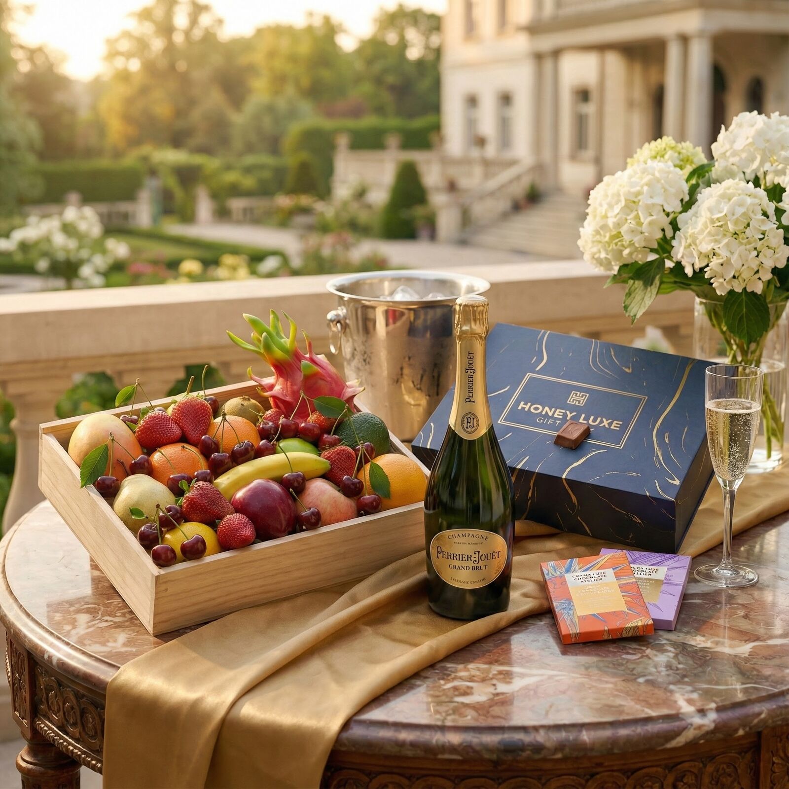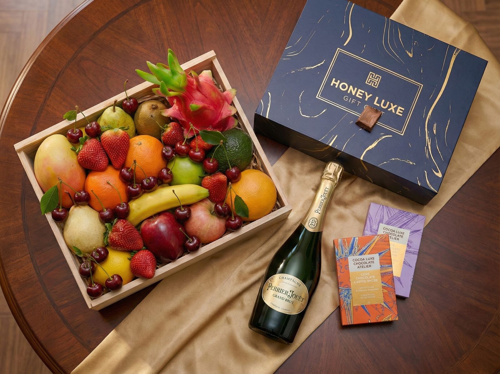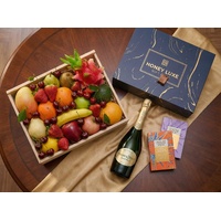 A refined luxury gift for exceptional celebrations. Filled with Premium Handpicked Seasonal Fruit, this hamper delivers fresh, vibrant flavour. Paired with Coffee & Dark Chocolate Bliss, it offers a beautifully balanced gourmet treat. The highlight is Perrier-Jouët Grand Brut Champagne, celebrated for its floral elegance, citrus brightness and silky bubbles — the perfect companion to fresh fruit and premium gifting.