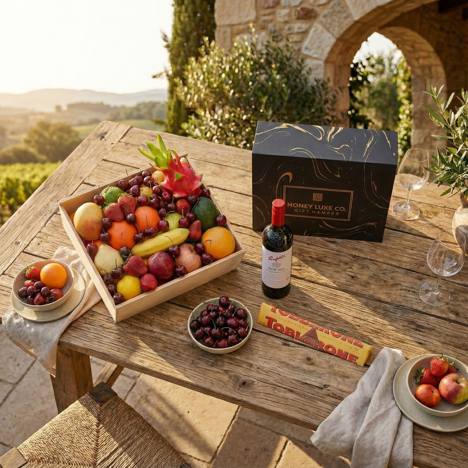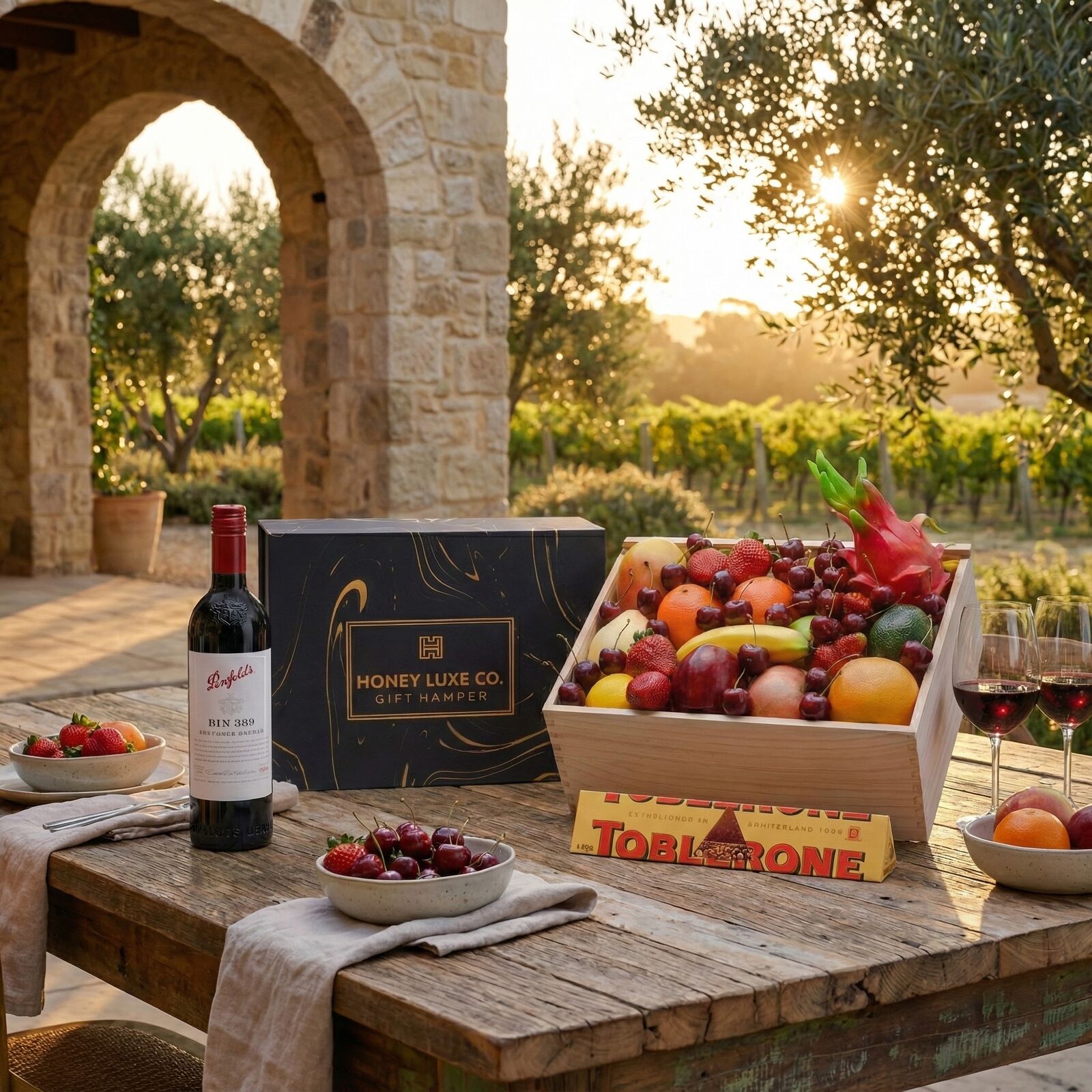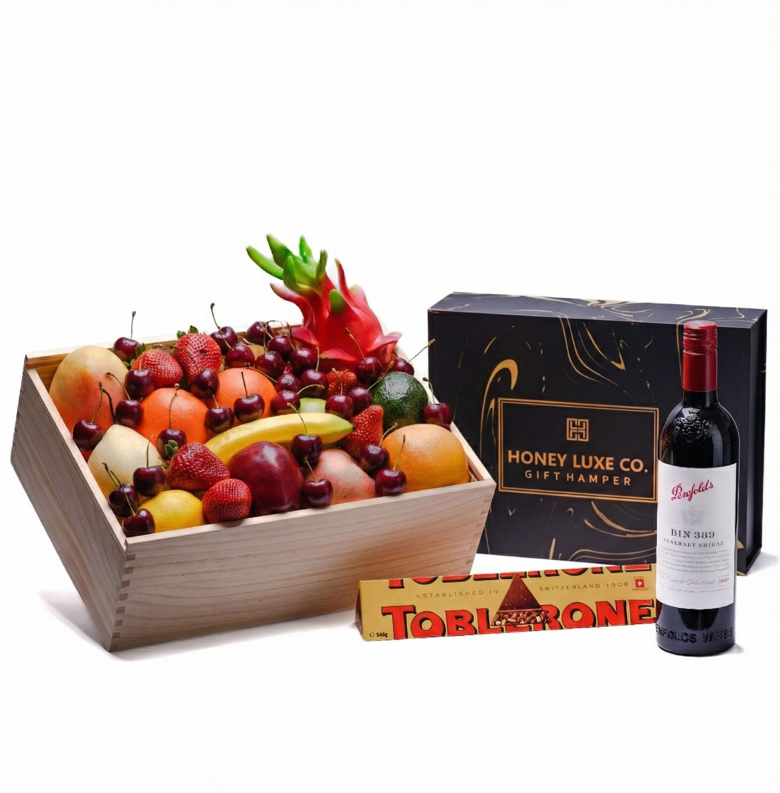 Combines the freshness of handpicked seasonal fruit with the prestige and depth of one of Australia’s most iconic wines — Penfolds Bin 389 Cabernet Shiraz. Known as the “Baby Grange,” Bin 389 offers rich complexity, fine tannins and extraordinary flavour, making it a remarkable pairing for gourmet gifting. At the heart of the hamper is a generous selection of Premium Handpicked Seasonal Fruit, chosen for vibrant colour, sweetness and exceptional eating quality