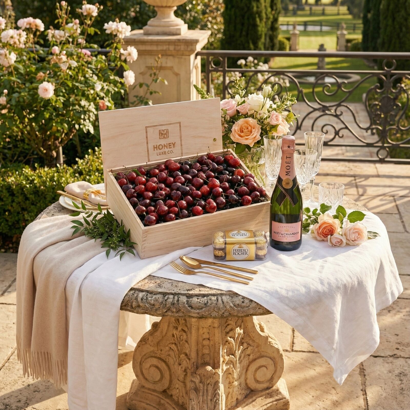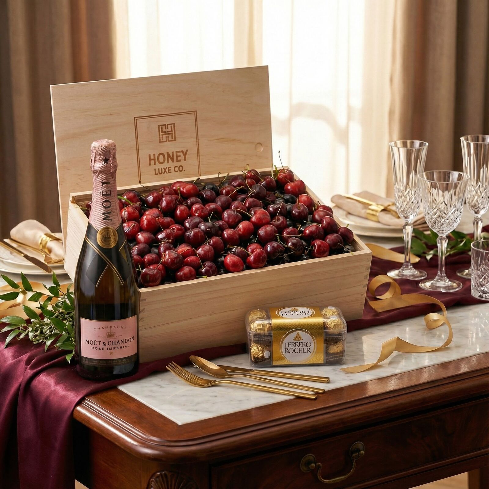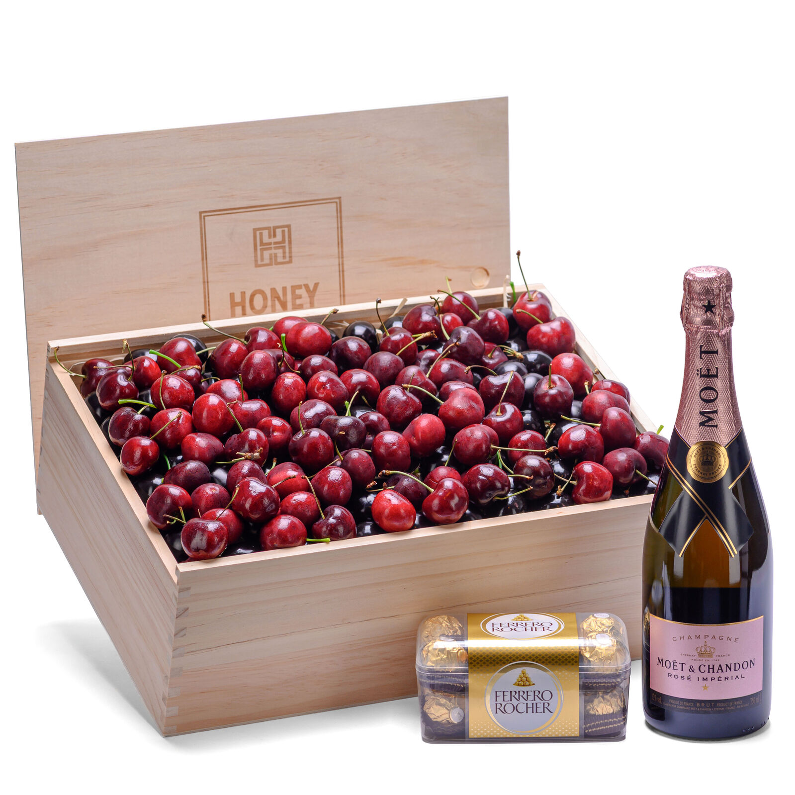 A refined and romantic gourmet gift, designed for elegant celebrations and heartfelt moments. Featuring Premium Handpicked Cherries, this hamper highlights exceptional sweetness, beautiful colour and orchard-fresh indulgence. The pairing of cherries with Moët & Chandon Rosé Impérial creates a stunning flavour harmony. This world-renowned rosé champagne offers vibrant berry notes, delicate bubbles and floral aromatics that complement the natural sweetness of the cherries.