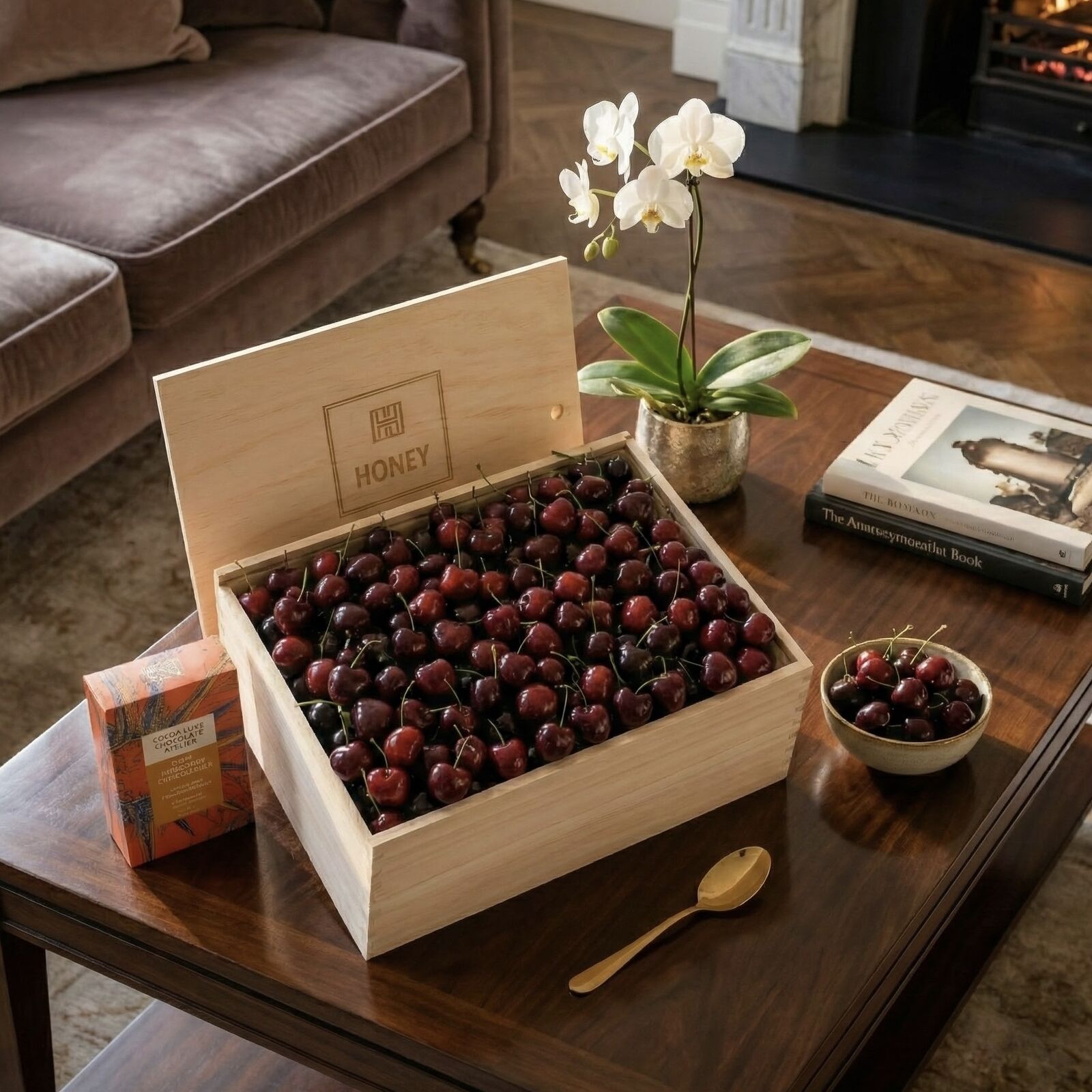 The Orchard Ruby Cherry Gift Hamper is a vibrant and elegant seasonal gift designed for those who appreciate freshness, colour, and gourmet indulgence. Featuring premium handpicked cherries, this hamper showcases exceptional sweetness, firmness, and orchard-fresh quality — an exquisite expression of summer’s best produce. Complementing the fruit is Coffee & Dark Chocolate Bliss, a rich, aromatic blend of roasted coffee beans coated in smooth dark chocolate. The bittersweet notes provide a sophisticated contrast to the natural sweetness of the cherries, creating a balanced and memorable tasting experience.