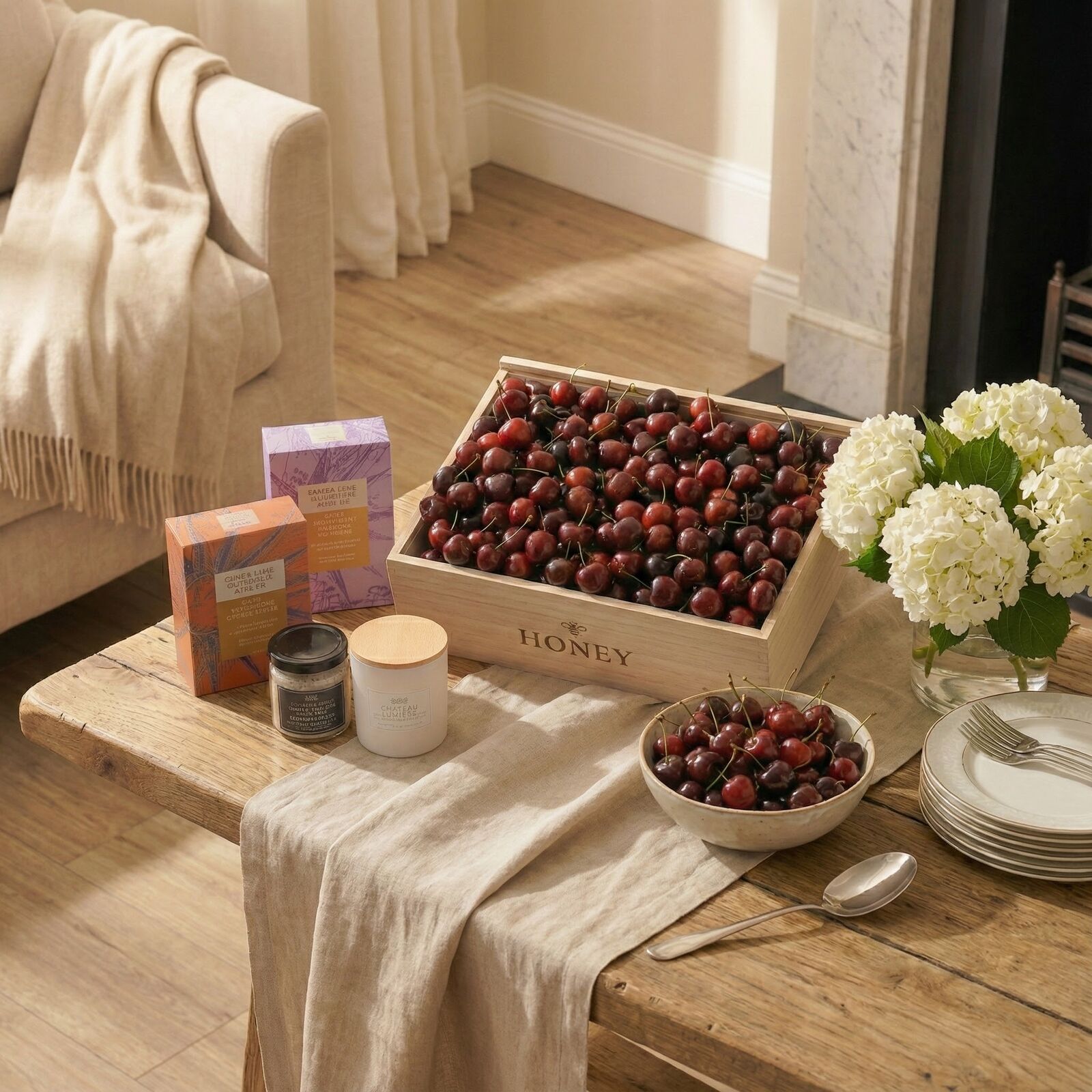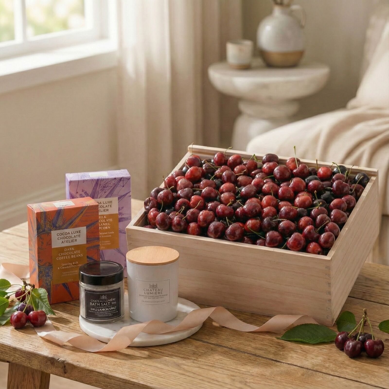 Blends orchard-fresh indulgence with luxurious wellness essentials, creating a beautifully calming and uplifting gifting experience. At its heart is a generous serving of Premium Handpicked Cherries, selected for exceptional sweetness, colour and fresh seasonal vibrancy. To complement the cherries, this hamper includes decadent chocolate treats and refined pamper elements.
