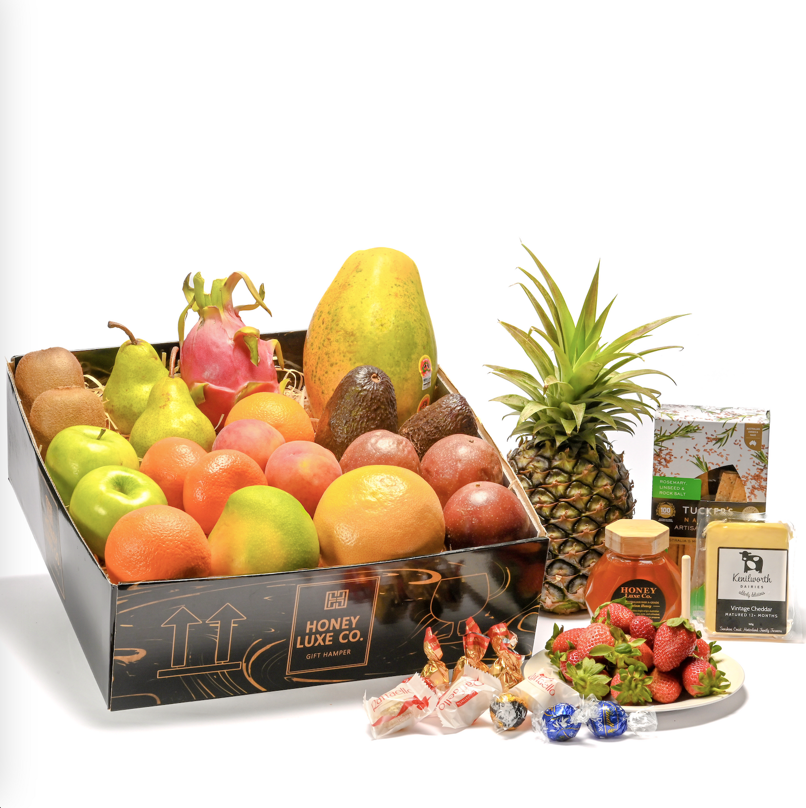 Hand-selected Premium Seasonal Fruit forms the heart of this vibrant collection, chosen for exceptional ripeness, colour, and sweetness. It’s perfectly complemented by creamy Kenilworth Dairies Vintage Cheddar, golden Honey Luxe Co. 100% Australian RAW A-Grade Premium Honey, and crunchy Artisan Rosemary Linseed & Rock Salt Crackers.