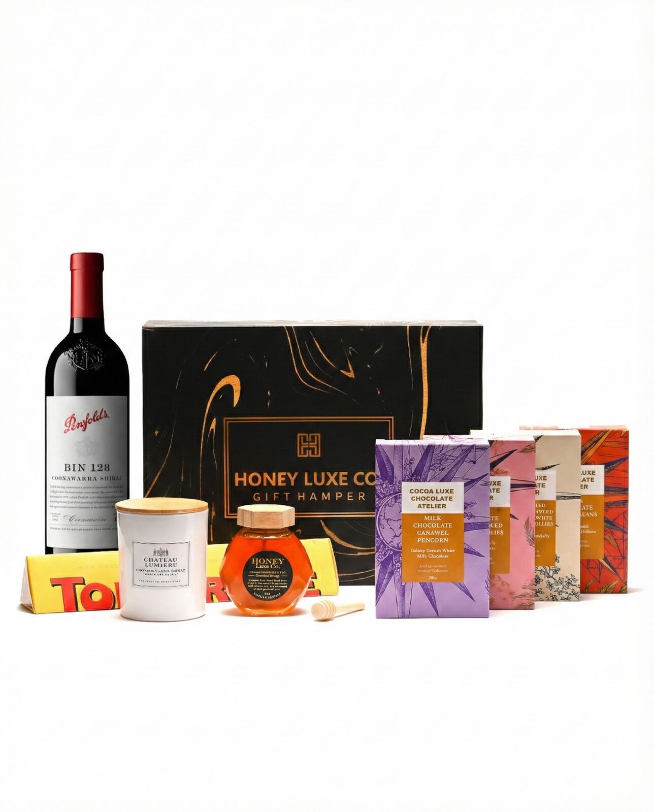 A refined luxury gift ideal for elegant celebrations, thoughtful gestures, and premium corporate gifting. Featuring Penfolds Bin 128 Coonawarra Shiraz, this cool-climate Australian red is paired with an indulgent selection of gourmet chocolates including Toblerone Orange Twist, Raspberry White Chocolate Jellies, White Chocolate Strawberry Bliss, Coffee & Dark Chocolate Bliss, and Golden Caramel Chocolate Popcorn. Finished with 100% Australian RAW A-Grade Premium Honey and a Château Lumière luxury scented candle, this hamper delivers effortless indulgence with a warm, sophisticated touch.